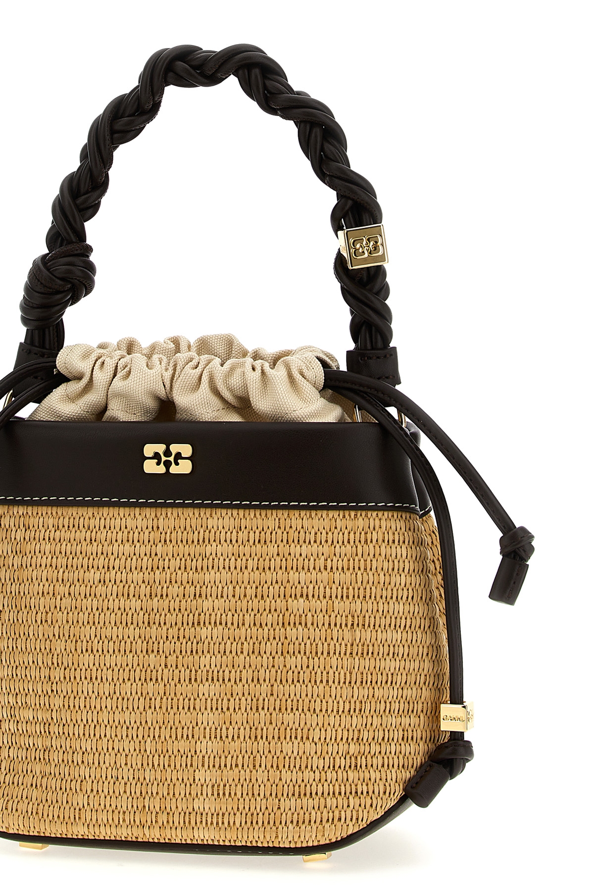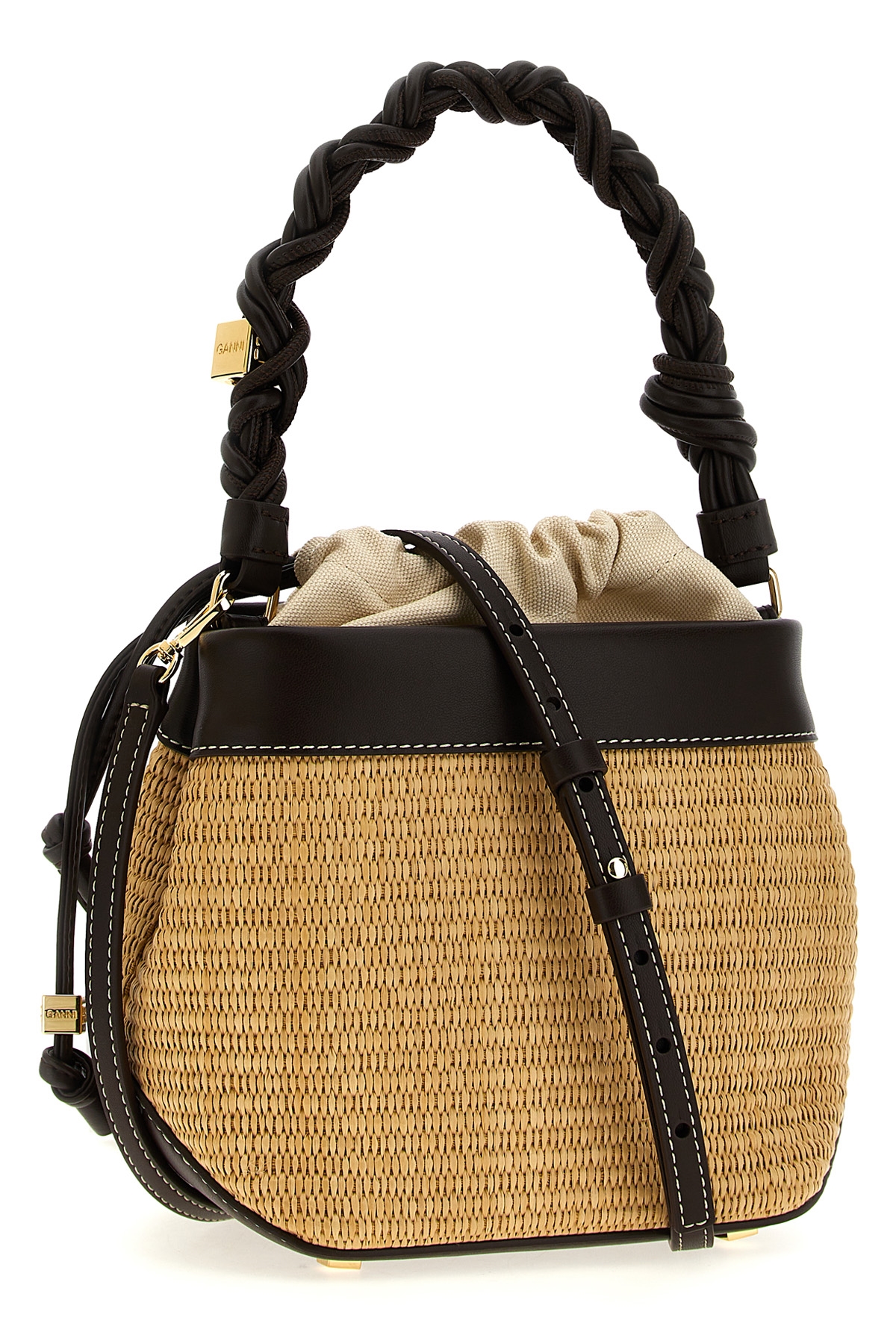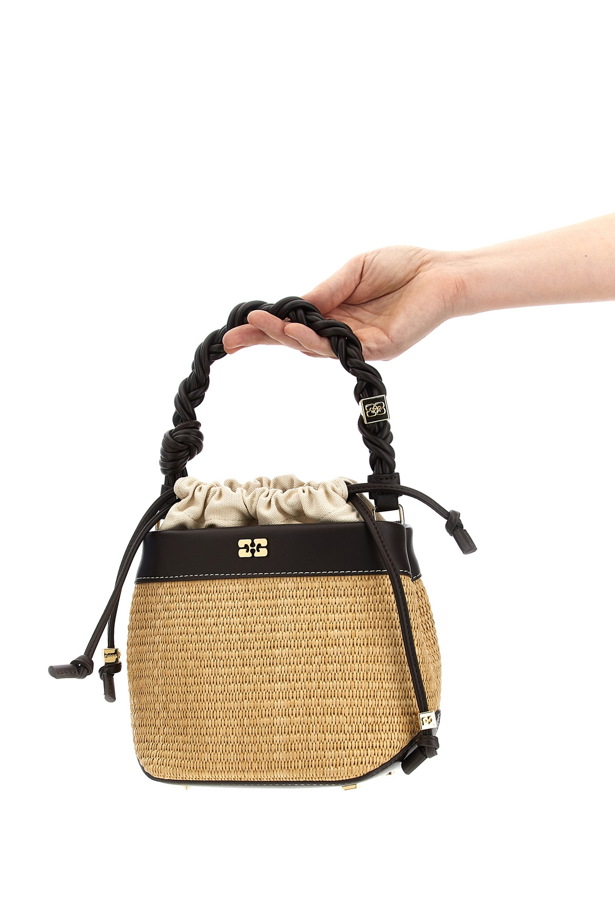Bou' raffia bucket handbag with leather and metal details, canvas lining with drawstring closure, GANNI Butterfly metal hardware logo on the front, woven leather handle, adjustable and removable shoulder strap.