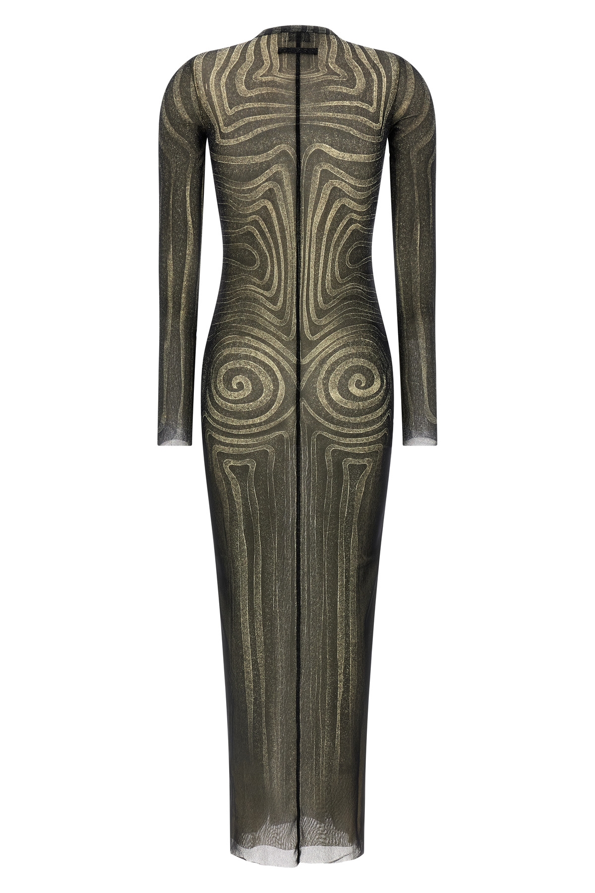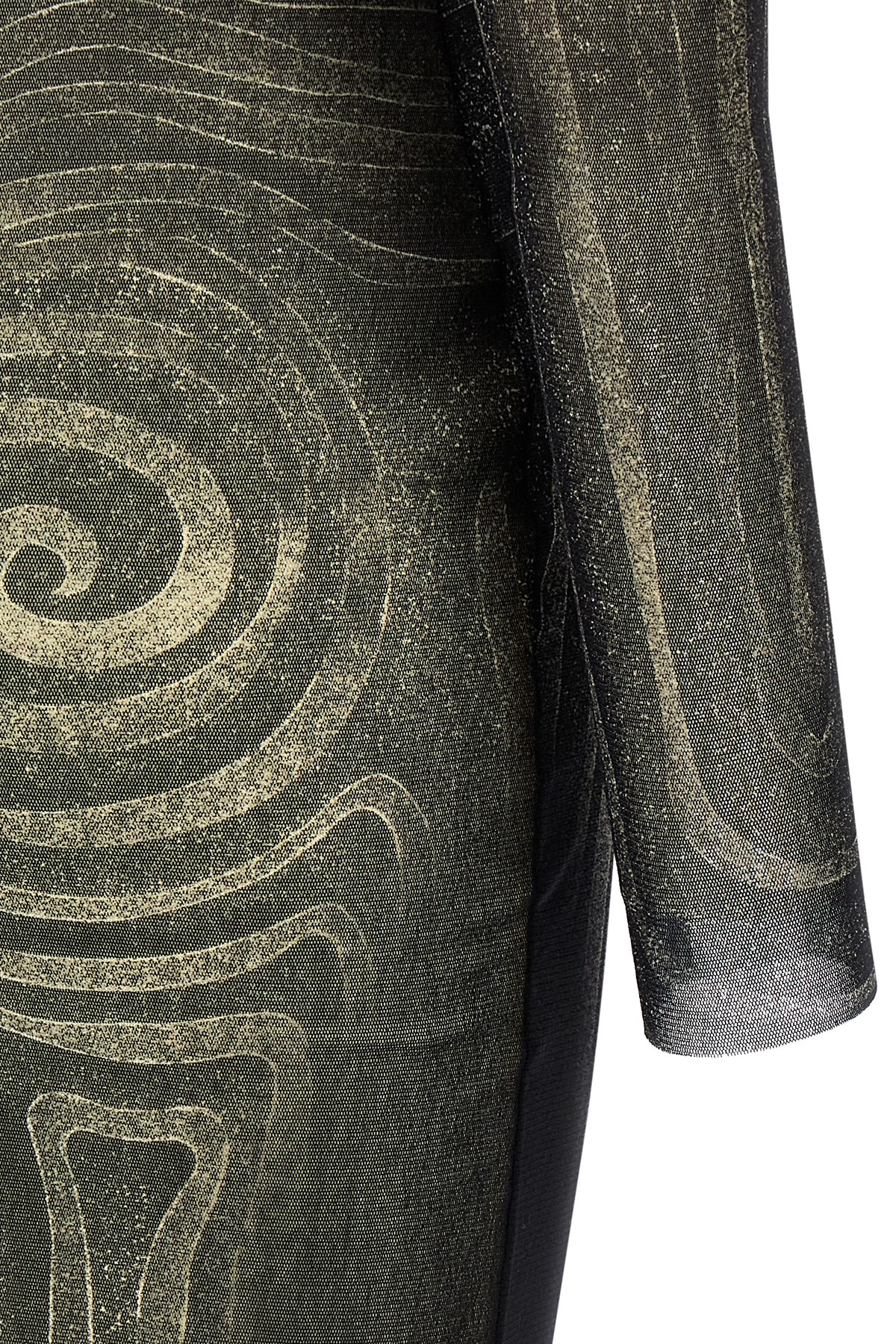 Semi-transparent printed stretch tulle dress, crew neck, long sleeves, raw cut hem.