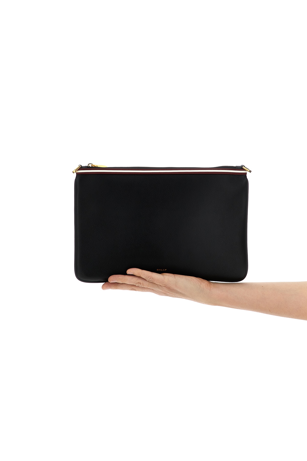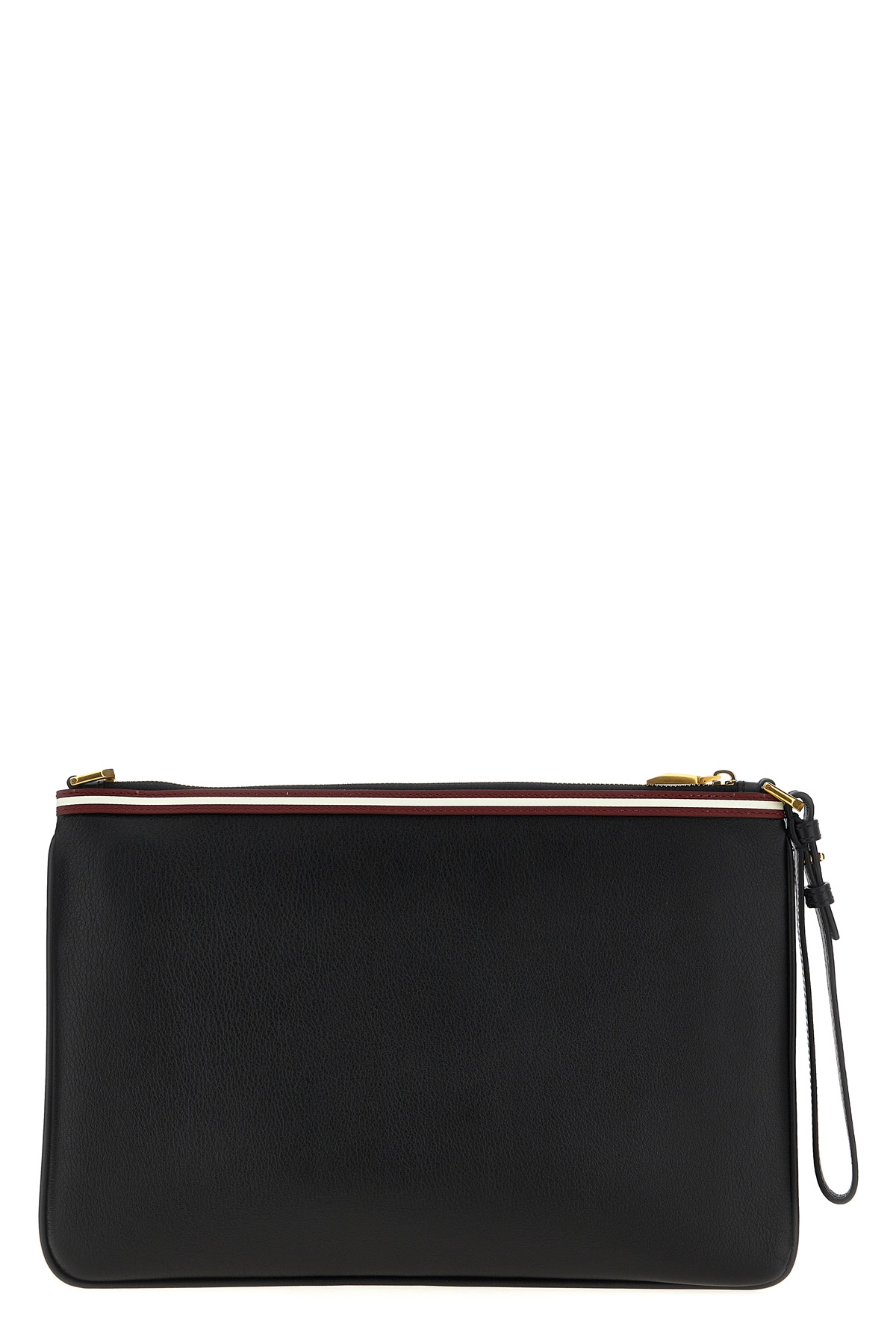 'Code Wristlet' leather clutch bag with contrasting detail, front embossed logo, zip closure, removable wrist handle, removable shoulder strap.