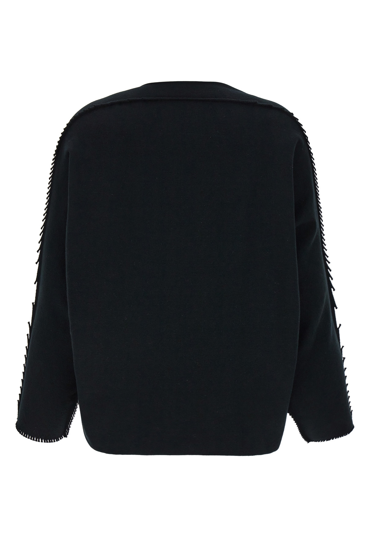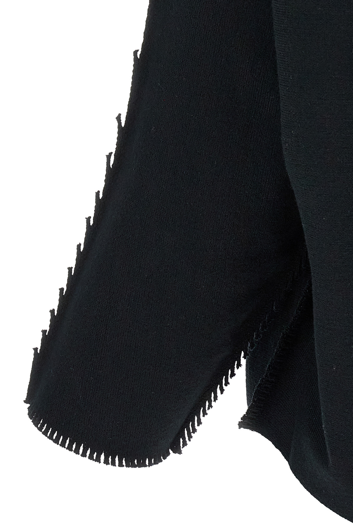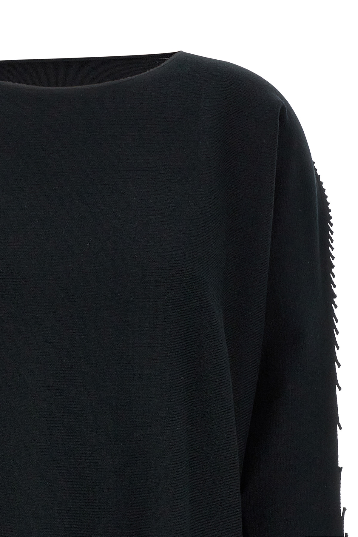 'Campagne' crewneck sweater in stretch cotton blend with bat sleeves, raw cut edges with fringed sleeves,