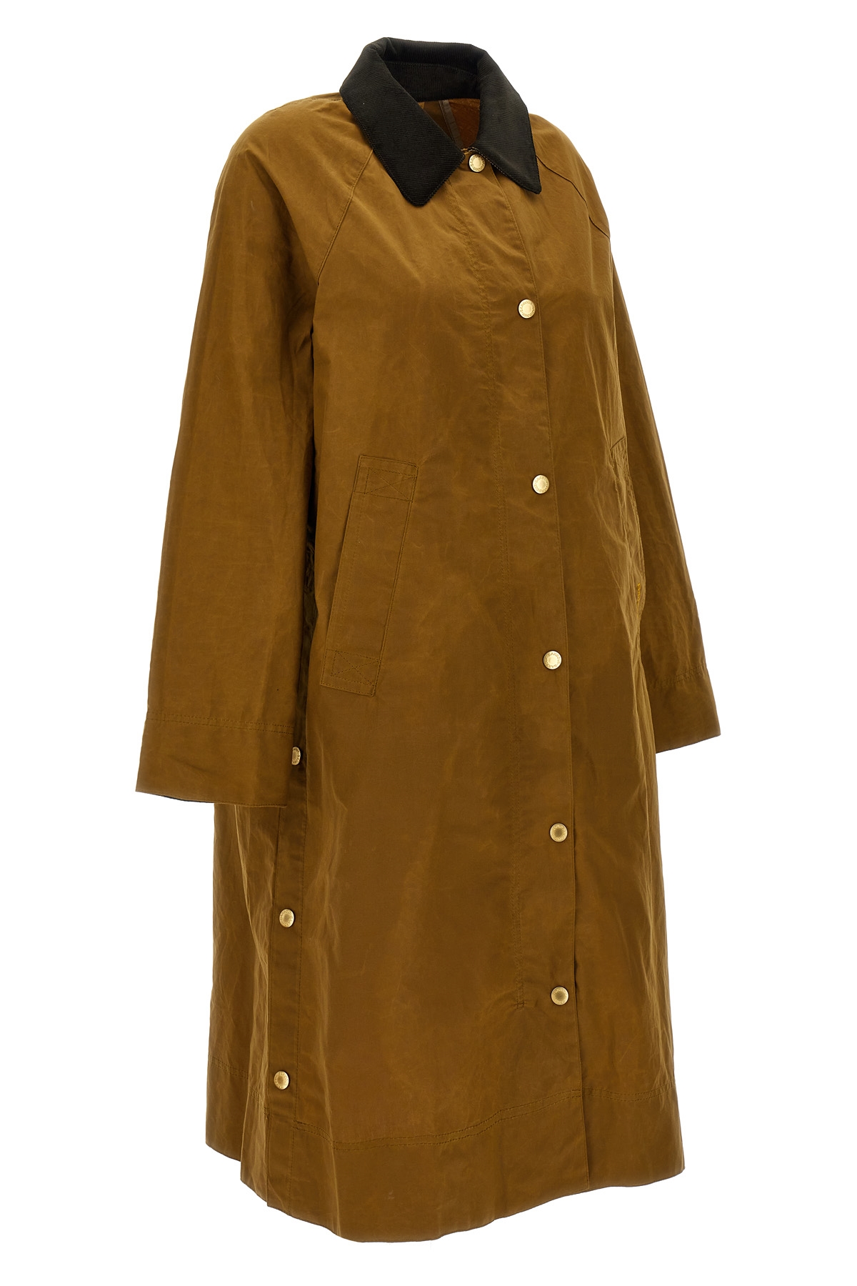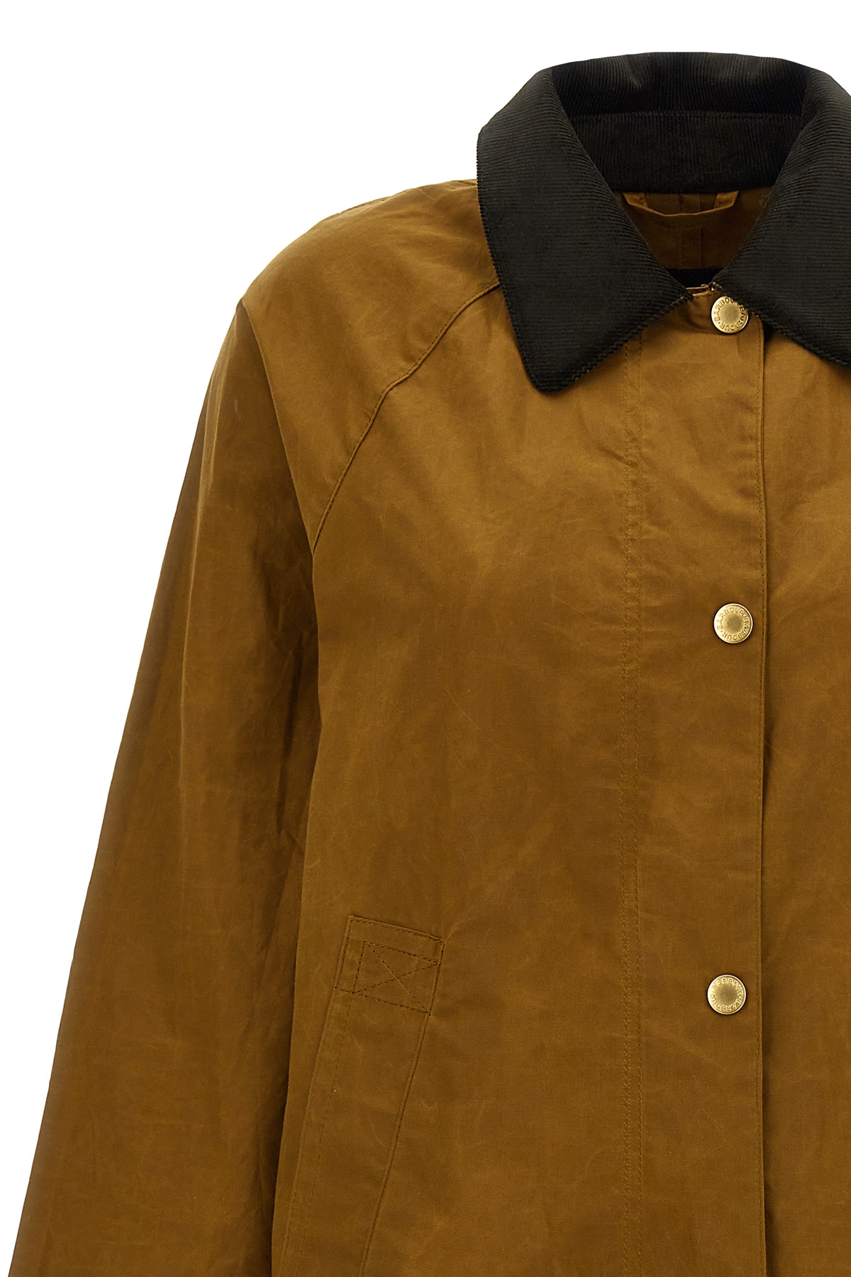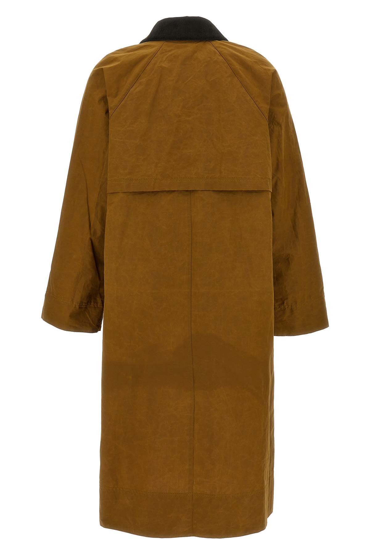 Long waxed cotton jacket Ettie with velvet collar, long sleeves with fold-up cuffs, side slits, and front logo embroidery.