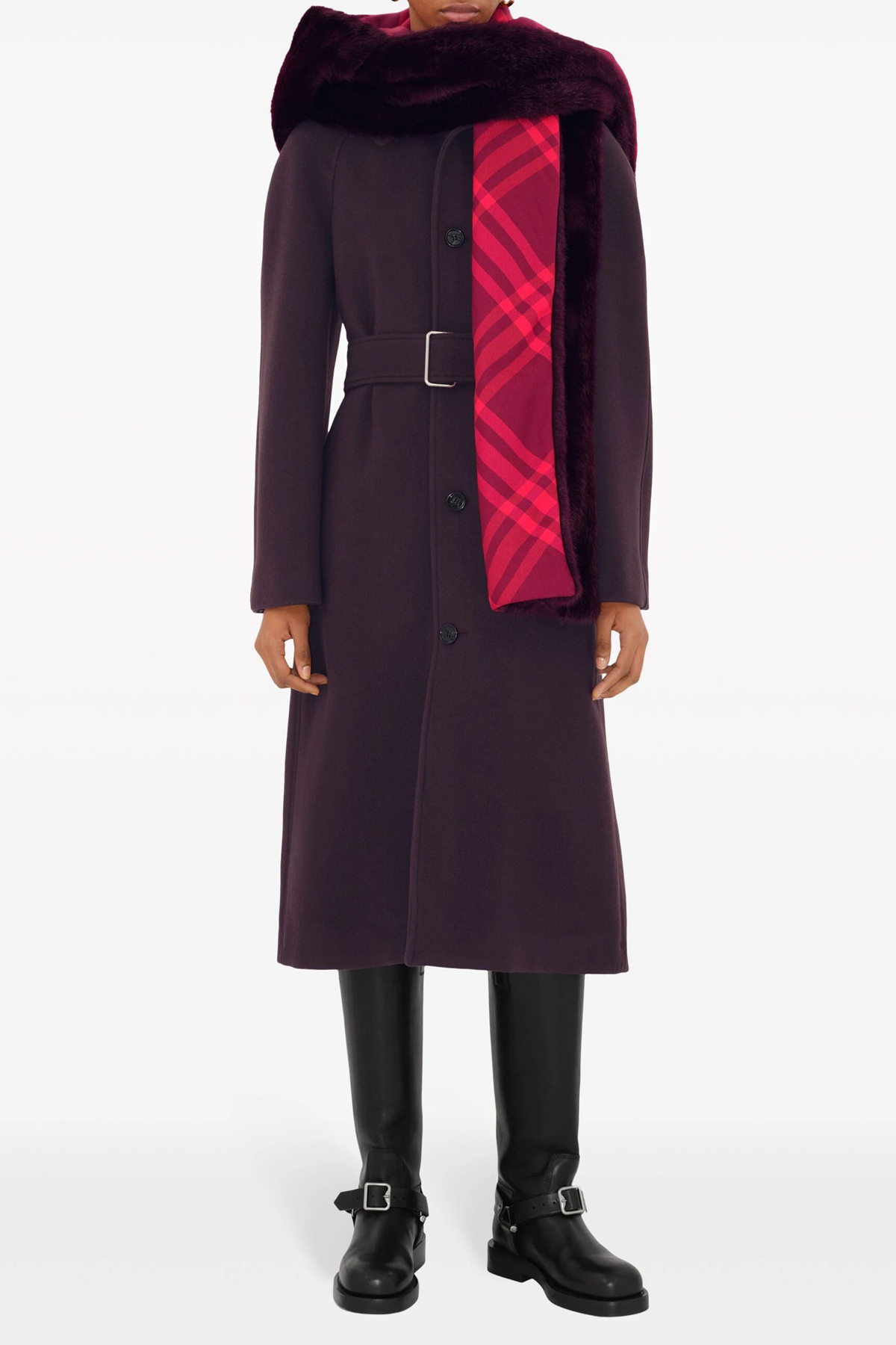 Faux fur hooded scarf with internal check print.