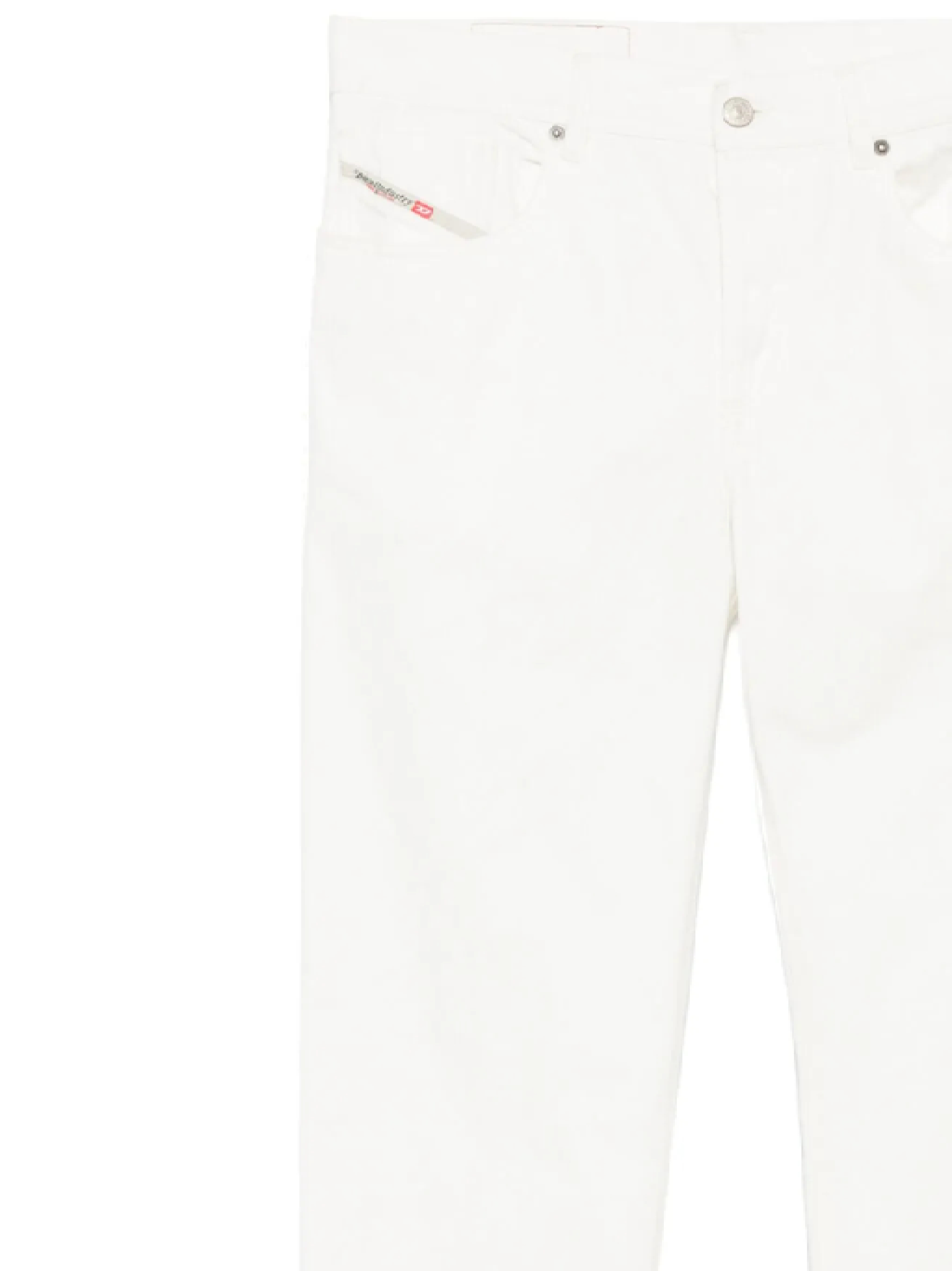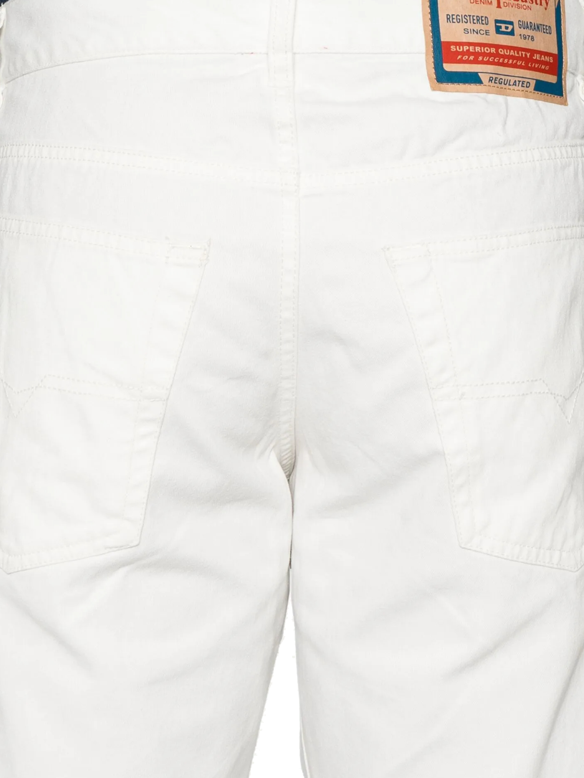 white button fly fastening belt loops classic five pockets logo patch to the rear