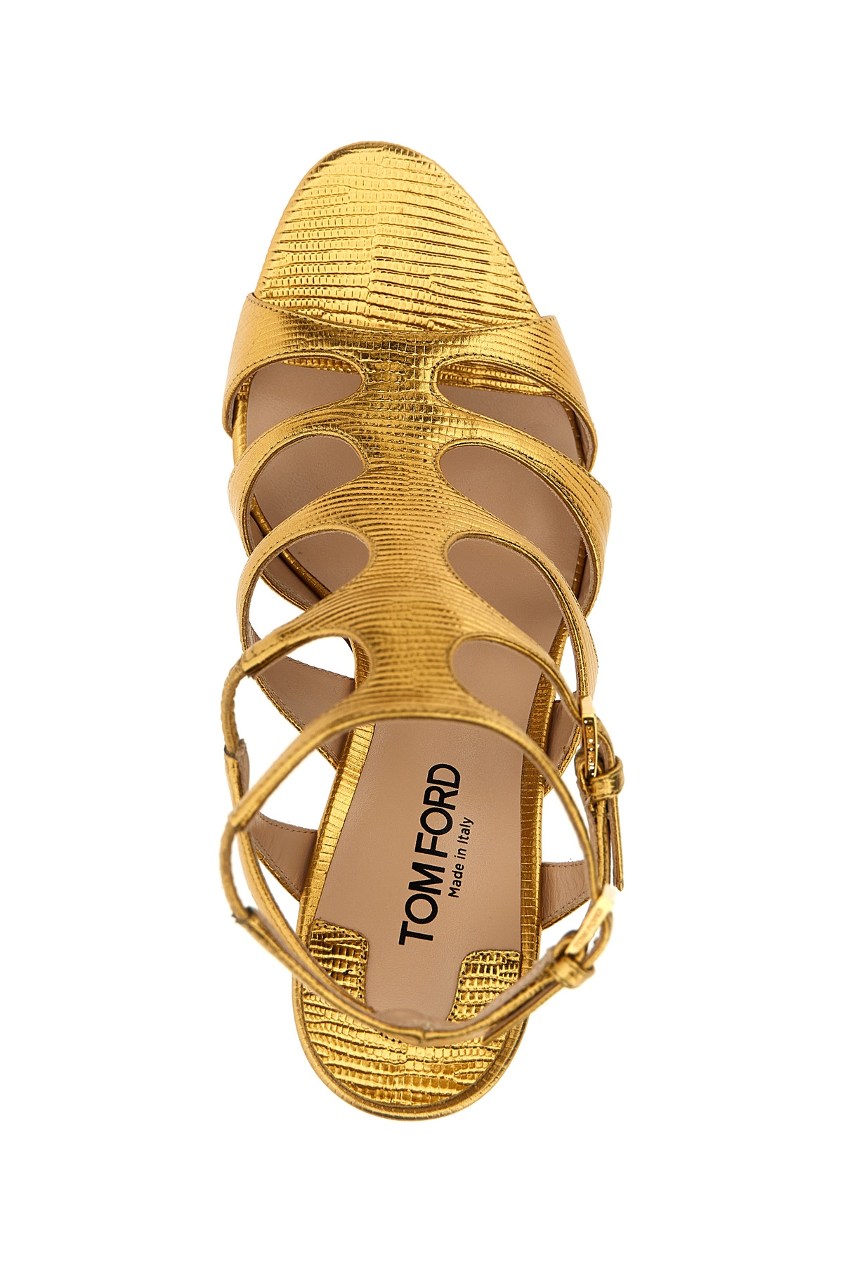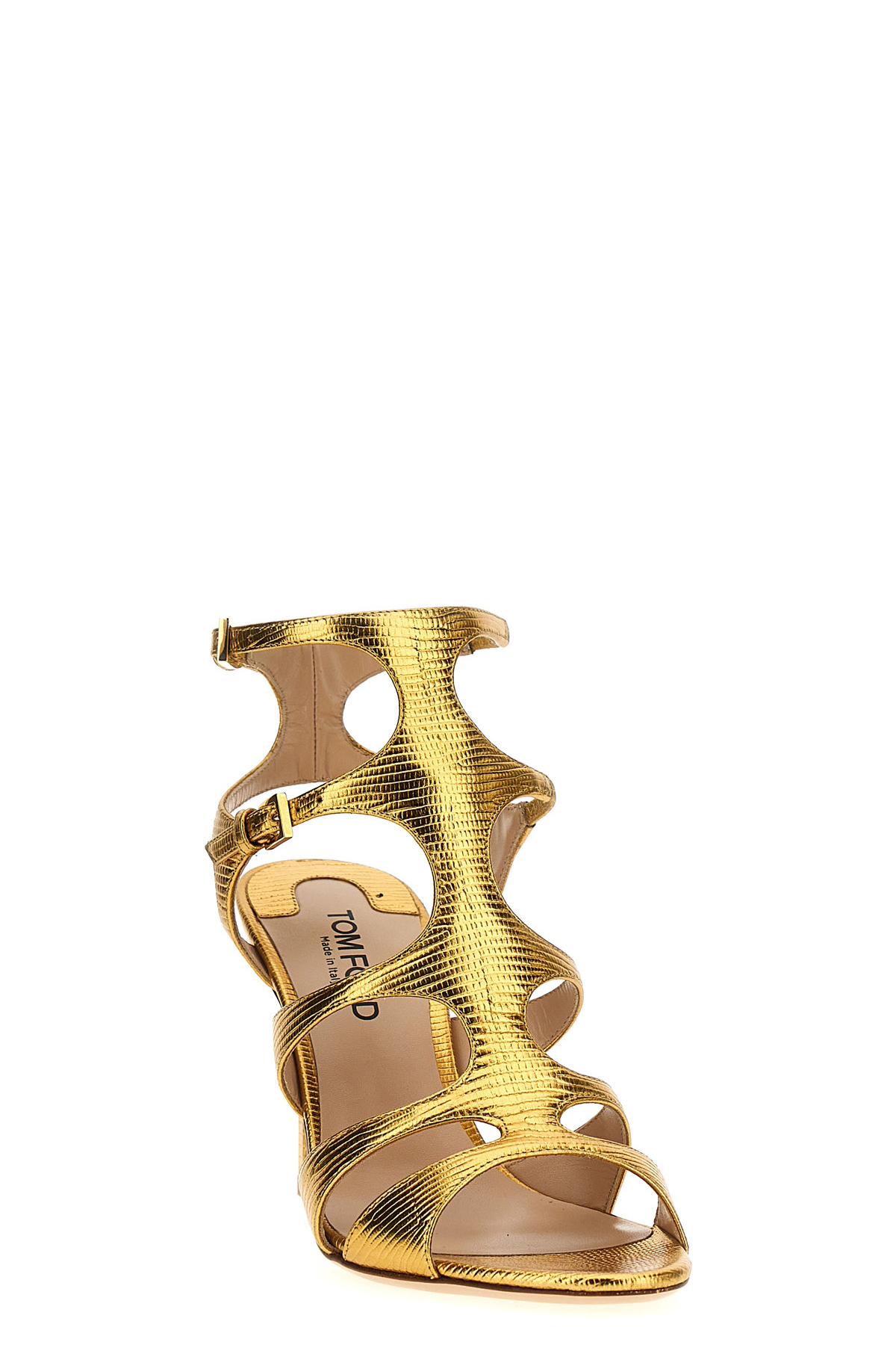 'Paradis' lizard print leather sandals with adjustable straps, heel, leather sole.