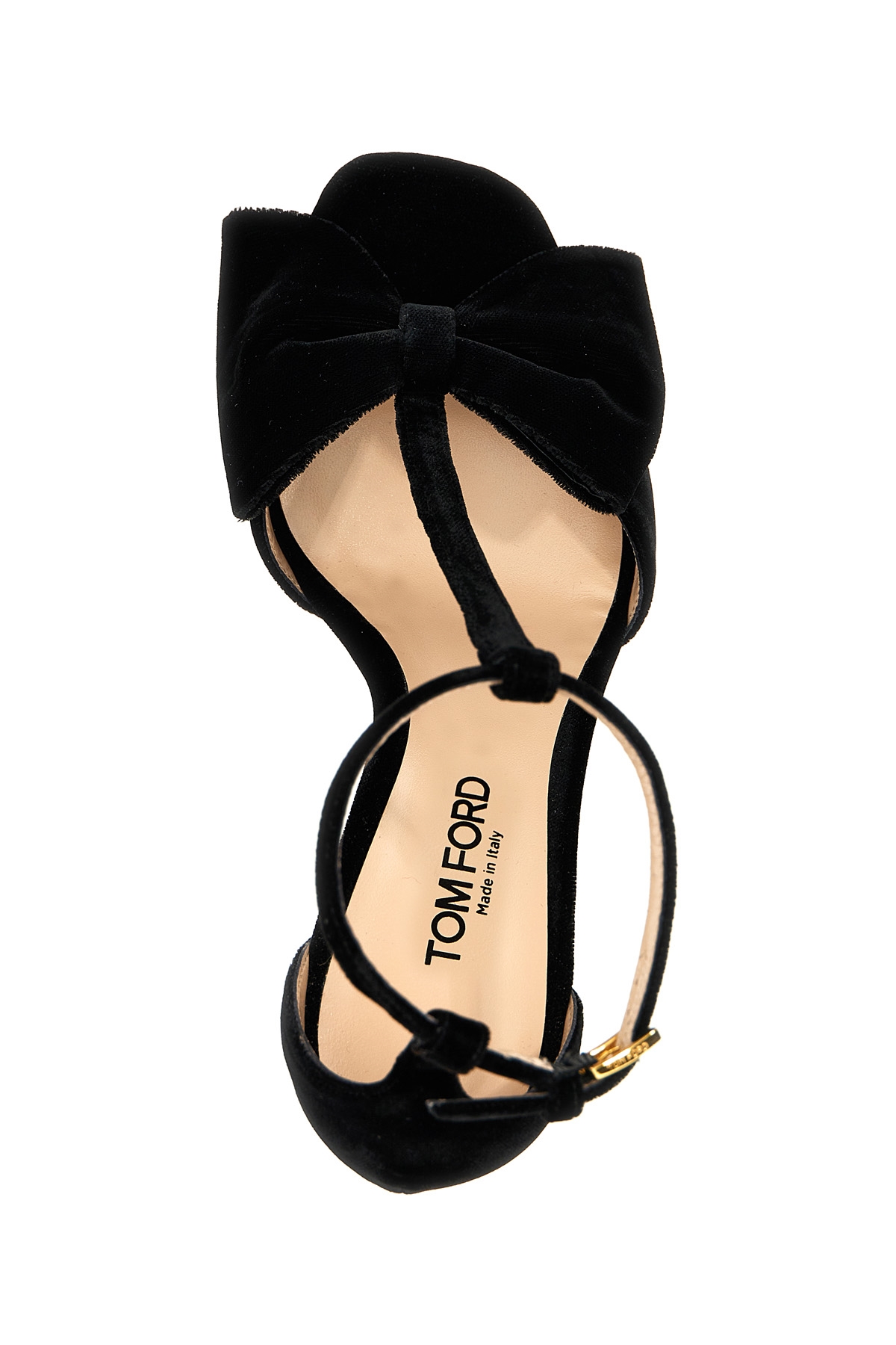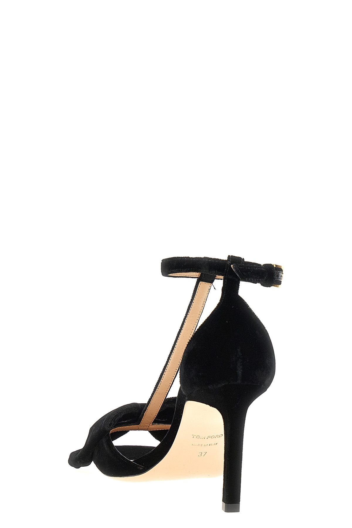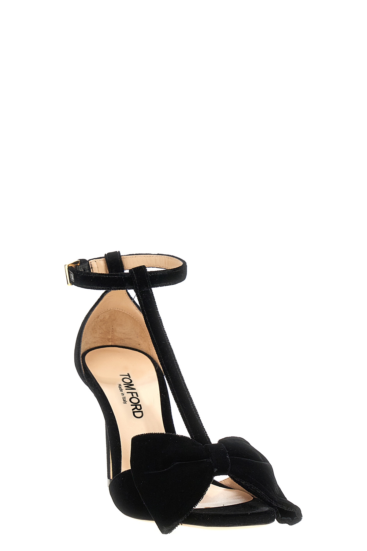 'Brigitte' velvet sandals with central bow application, adjustable strap, heel, leather sole.