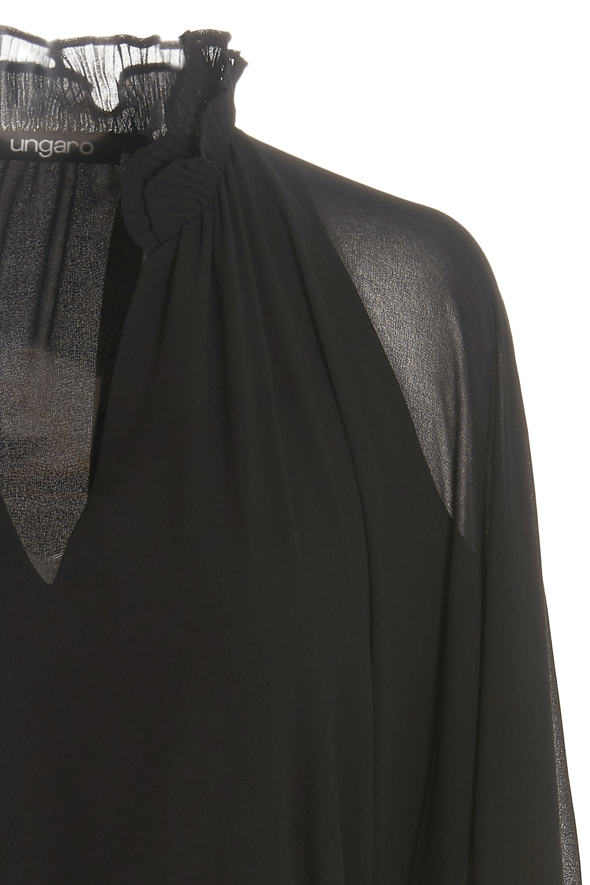 Ziva' chiffon crepe dress with ruches detail, belted waist, long and wide sleeves, V-neck and a lined garment.