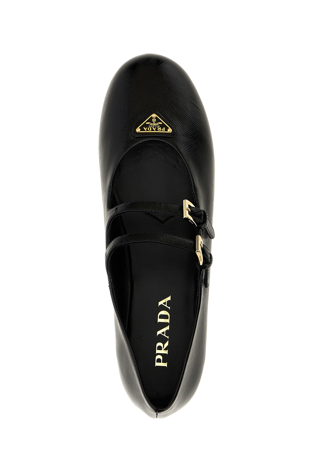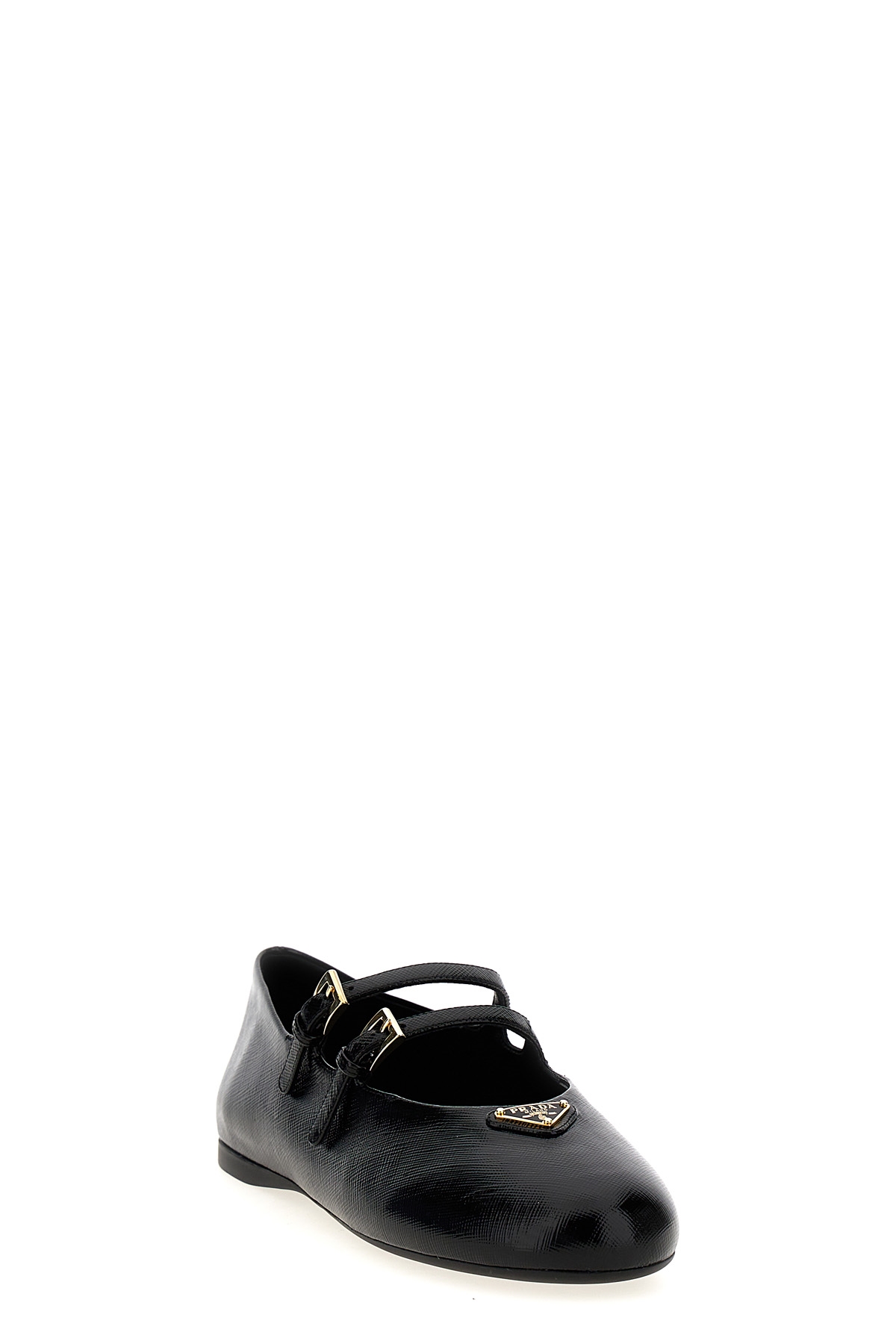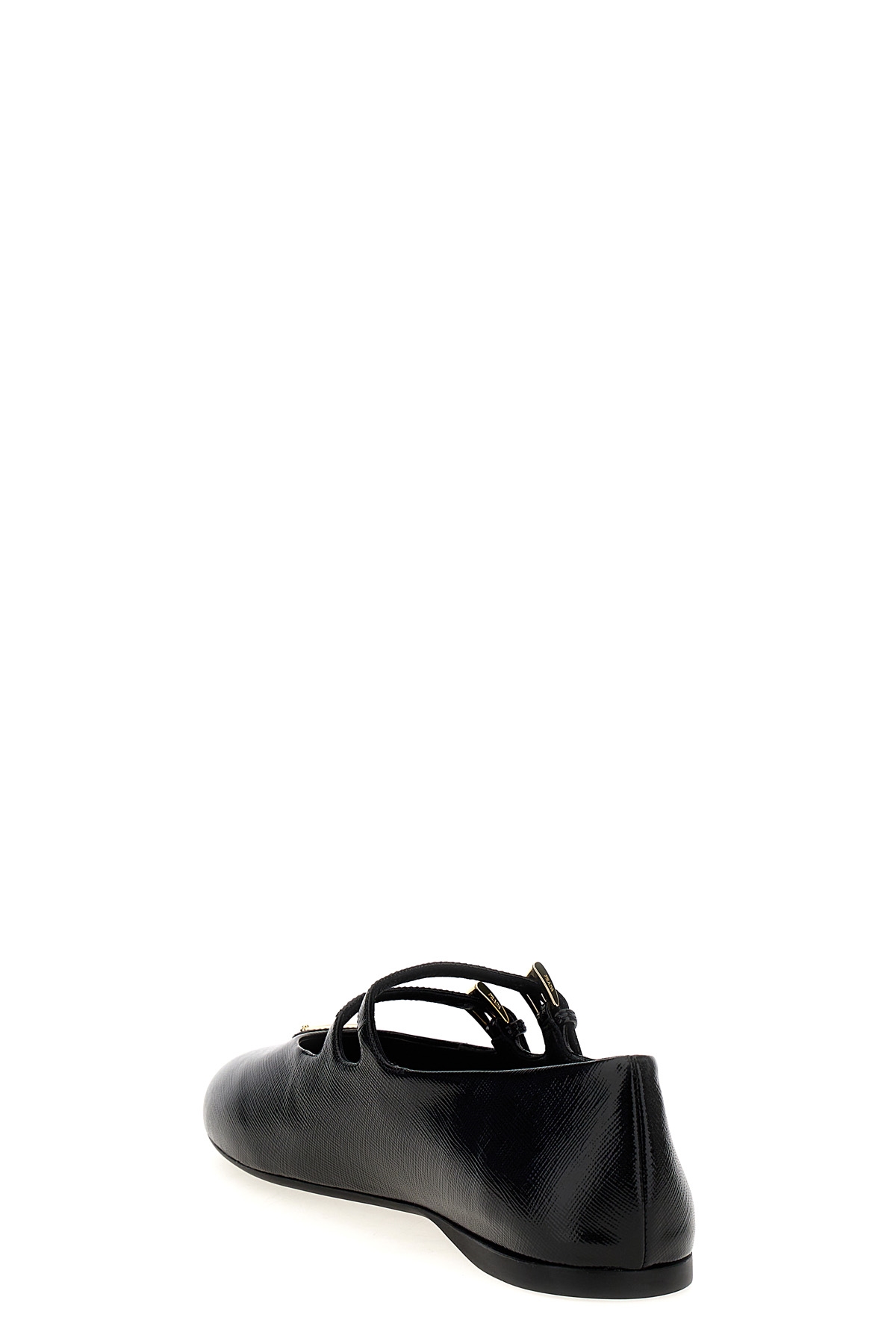 Polished Saffiano leather ballet flats with double adjustable strap, front enameled metal triangle logo, rubber sole.