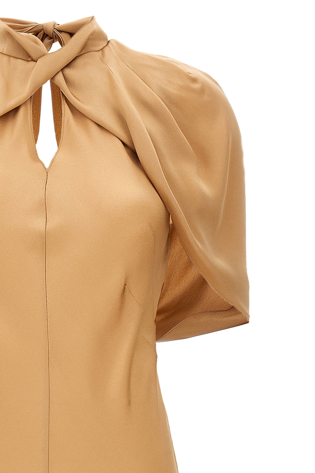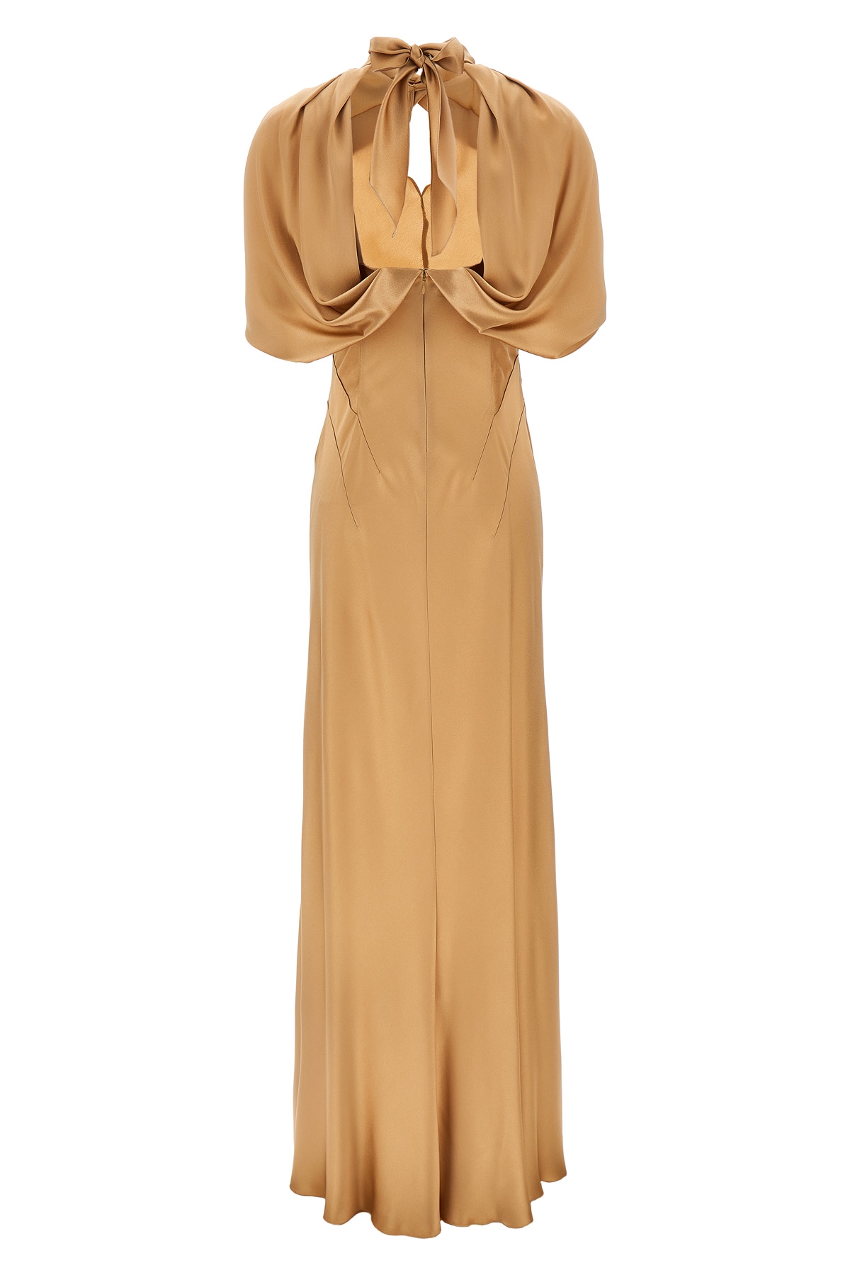 Long satin dress, high neck with front teardrop cut out and adjustable tape at the back, sleeveless with overlapping short-sleeved shawl, back zip closure.
