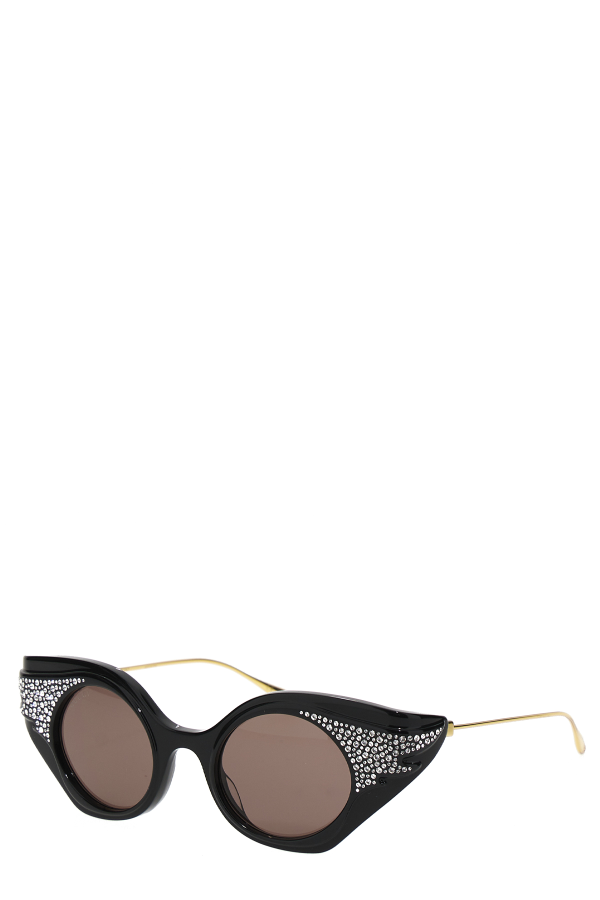 Cat eye acetate sunglasses with sequin appliques, colored lenses and gold metal temples.