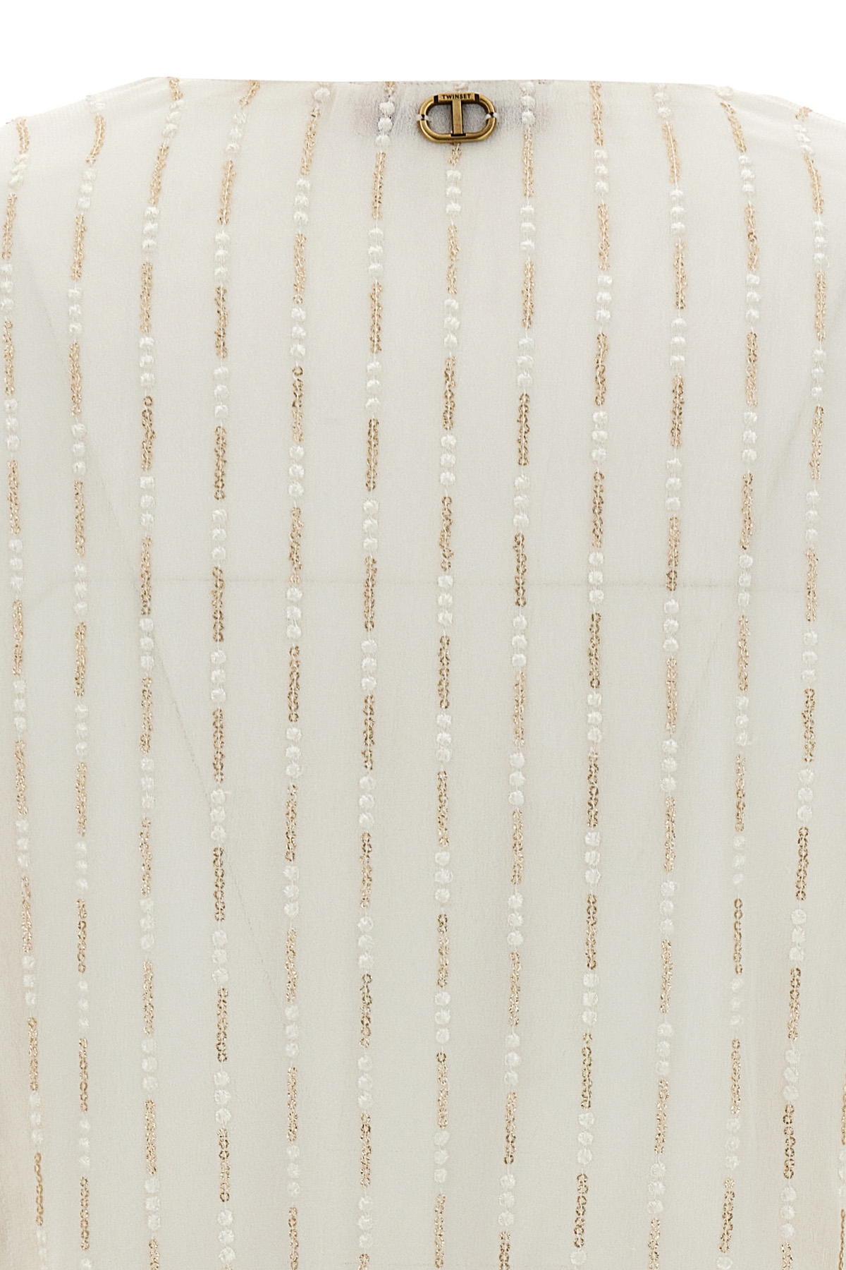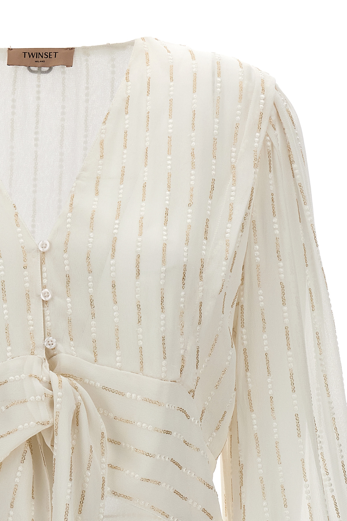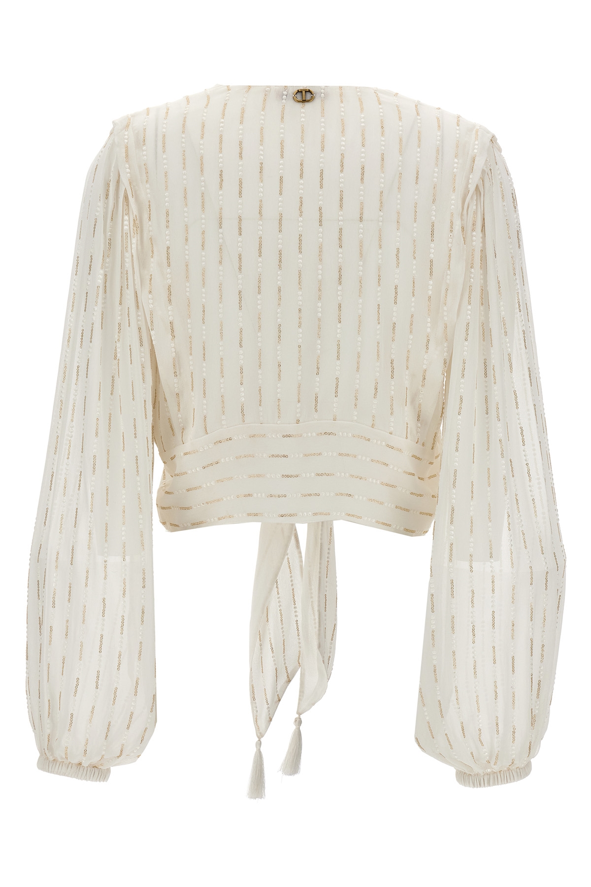 'Neve' cropped shirt in semi-transparent fabric with all-over glitter embroidery, front button closure and knotted bow, long sleeves, elastic cuffs.