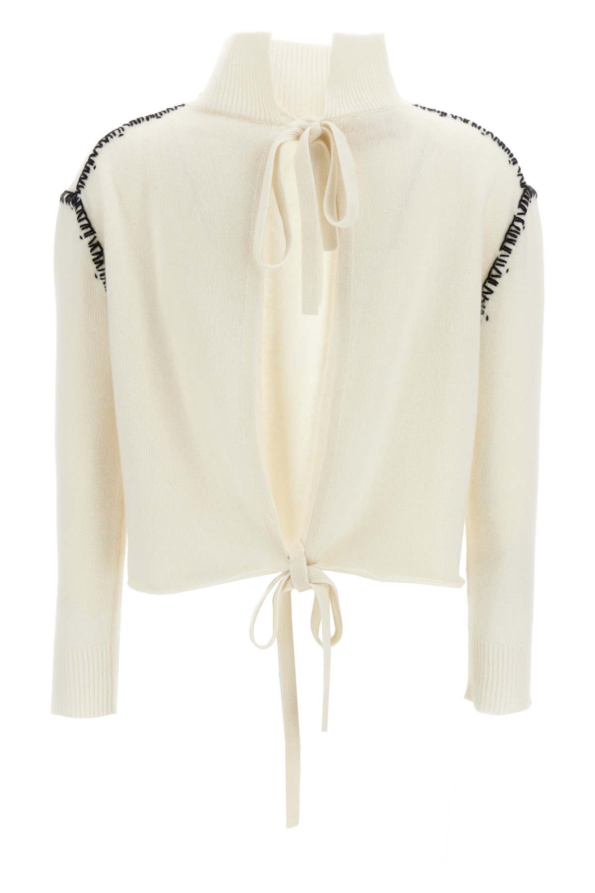 Cardigan in wool and cashmere blend, contrast mending details, lacing closure, high neck, long cuffed sleeves.
