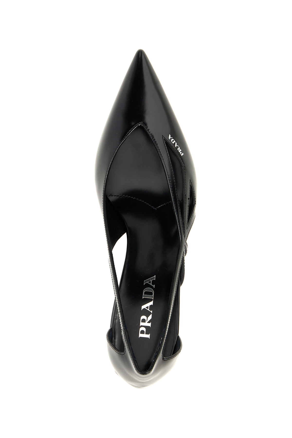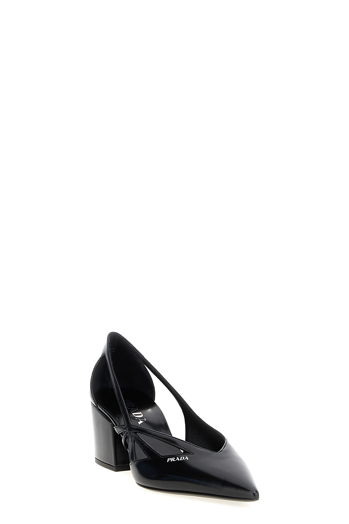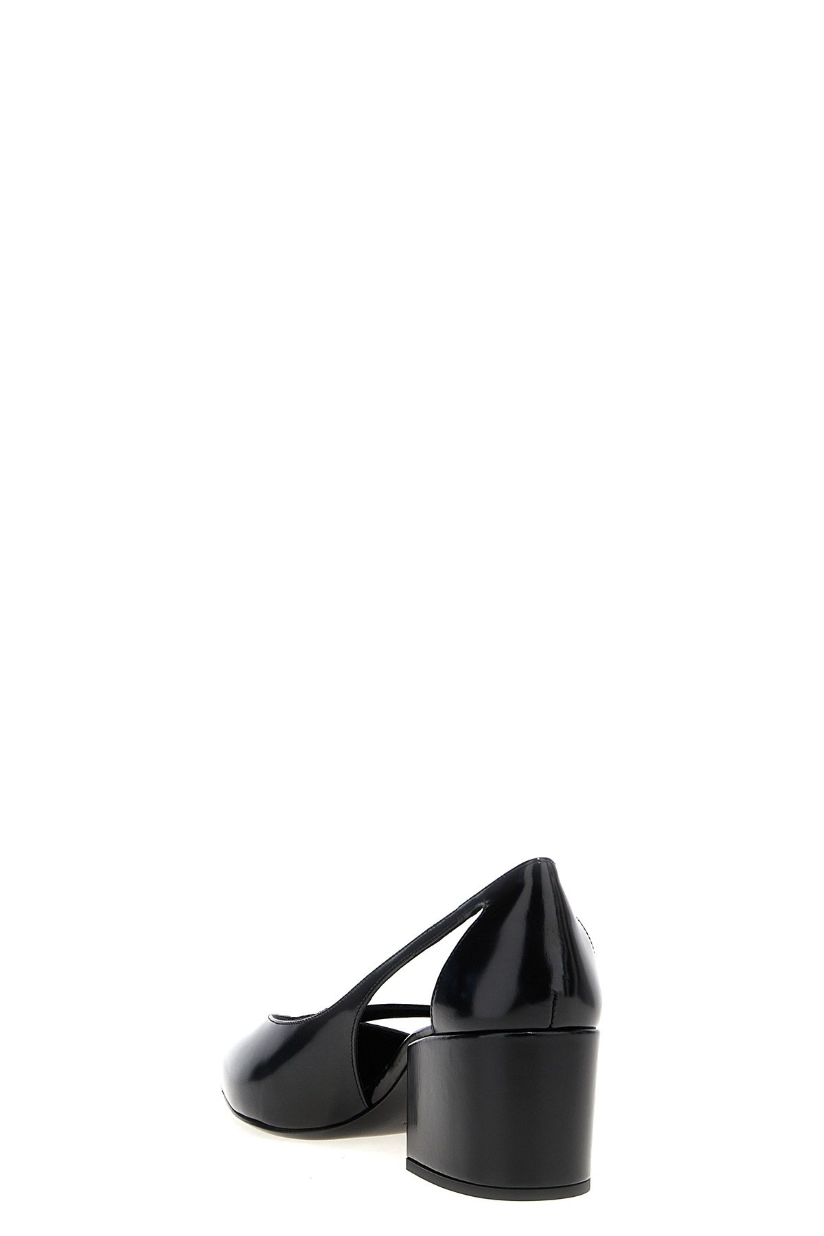 Brushed leather pumps with cut-out details, silk-screened logo, wide heels.