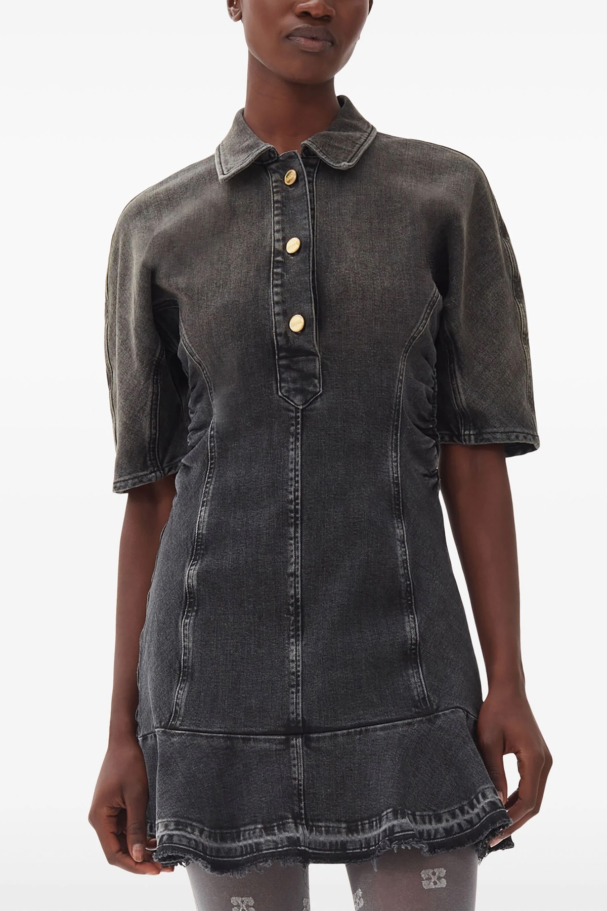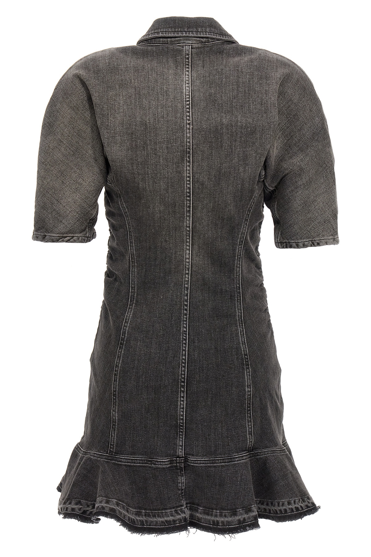 'Tint Edge' dress in stretch cotton denim with button neckline, short sleeves, tight and curled at the waist, frayed flounced hem.