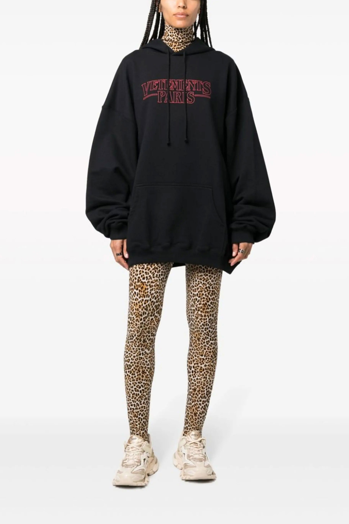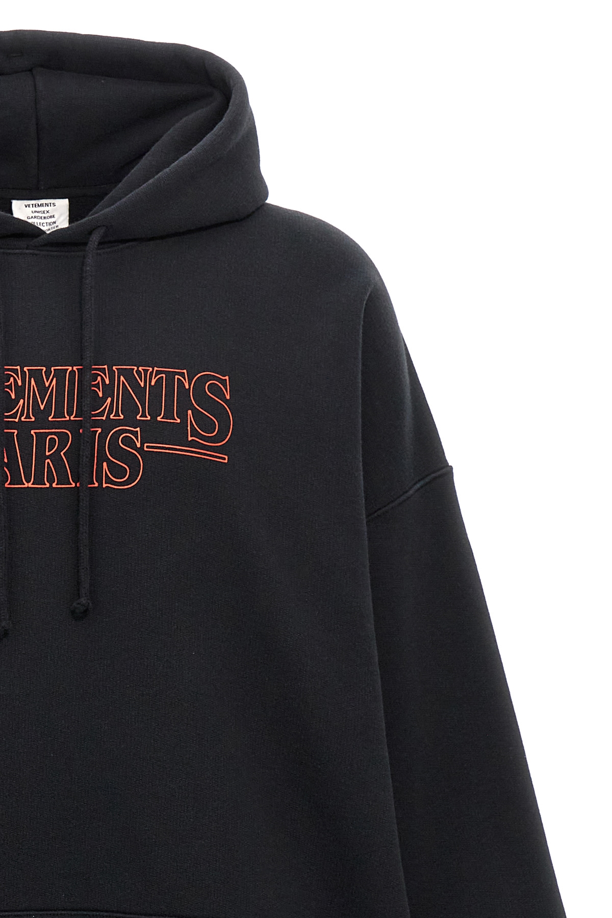 'Vetements Paris Logo' cotton blend hoodie with front logo print, kangaroo pocket, long cuffed sleeves.