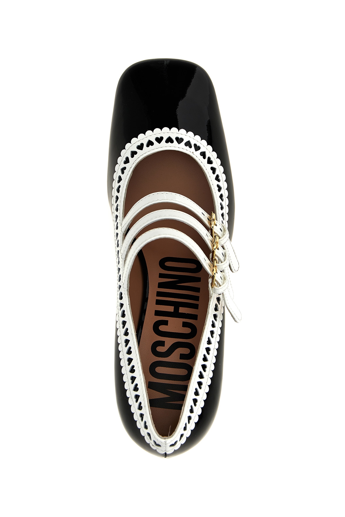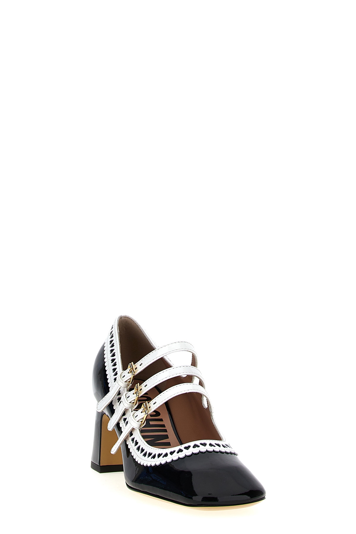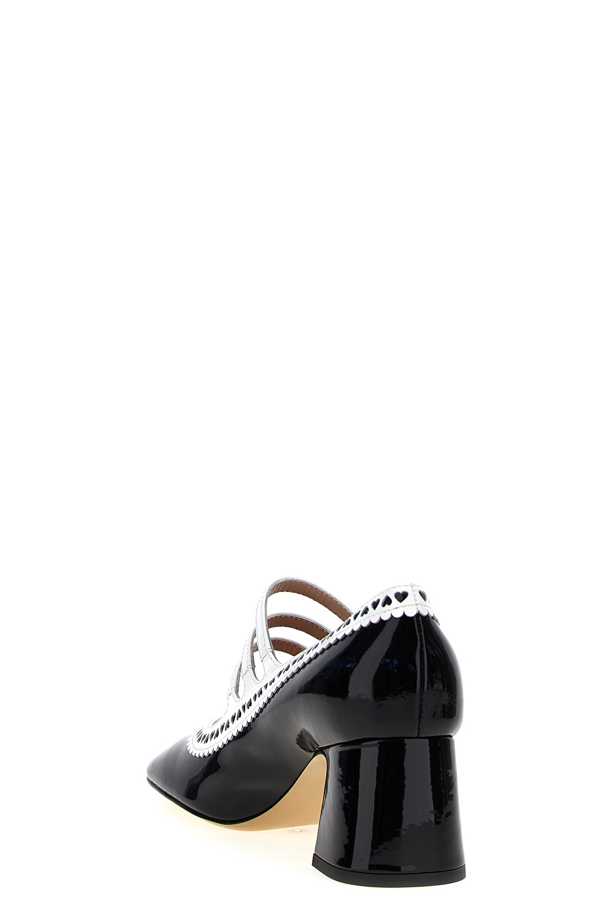 Patent leather pumps with contrasting finishing, heart-shaped perforated workmanship, adjustable straps with buckles.