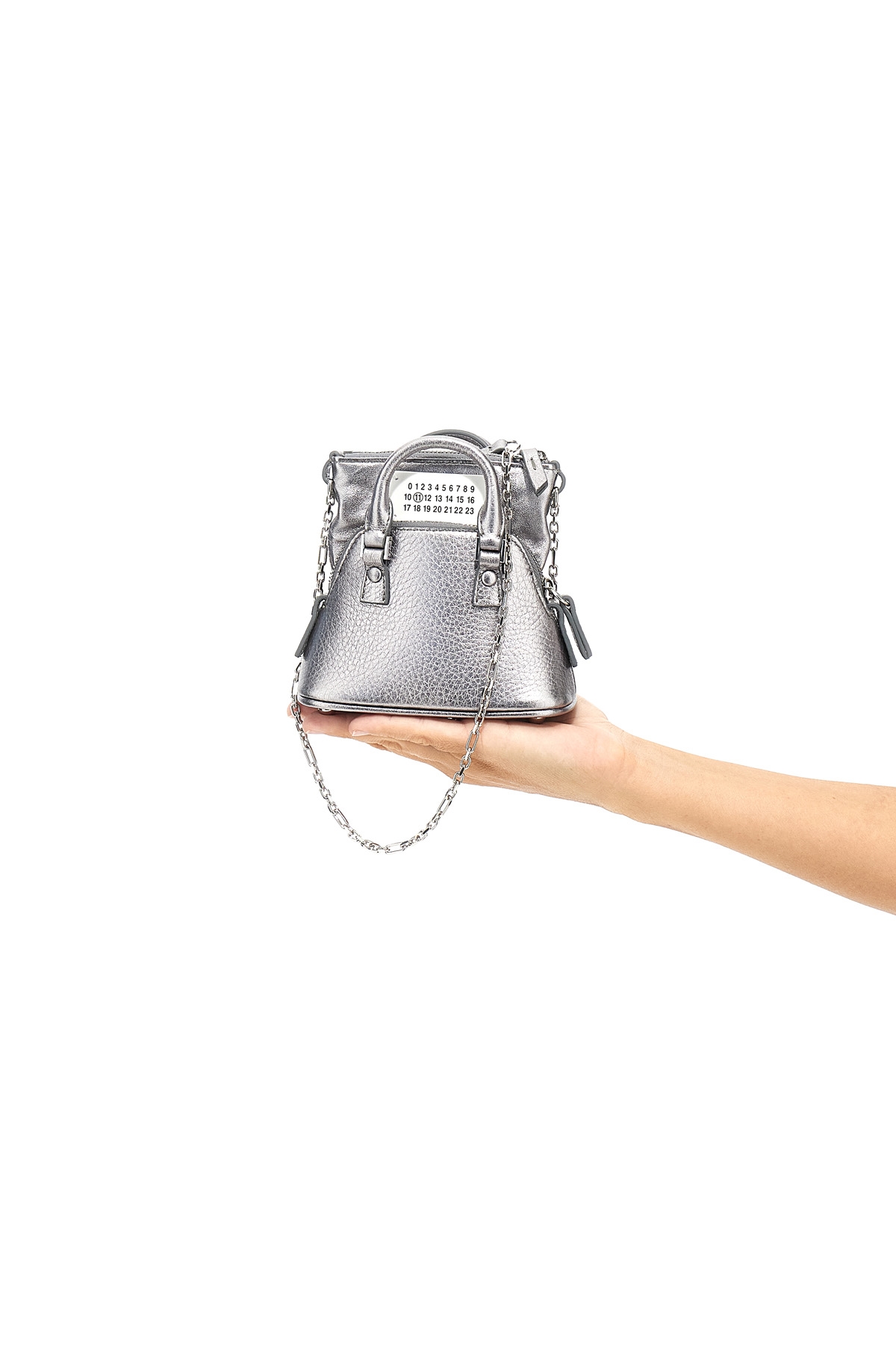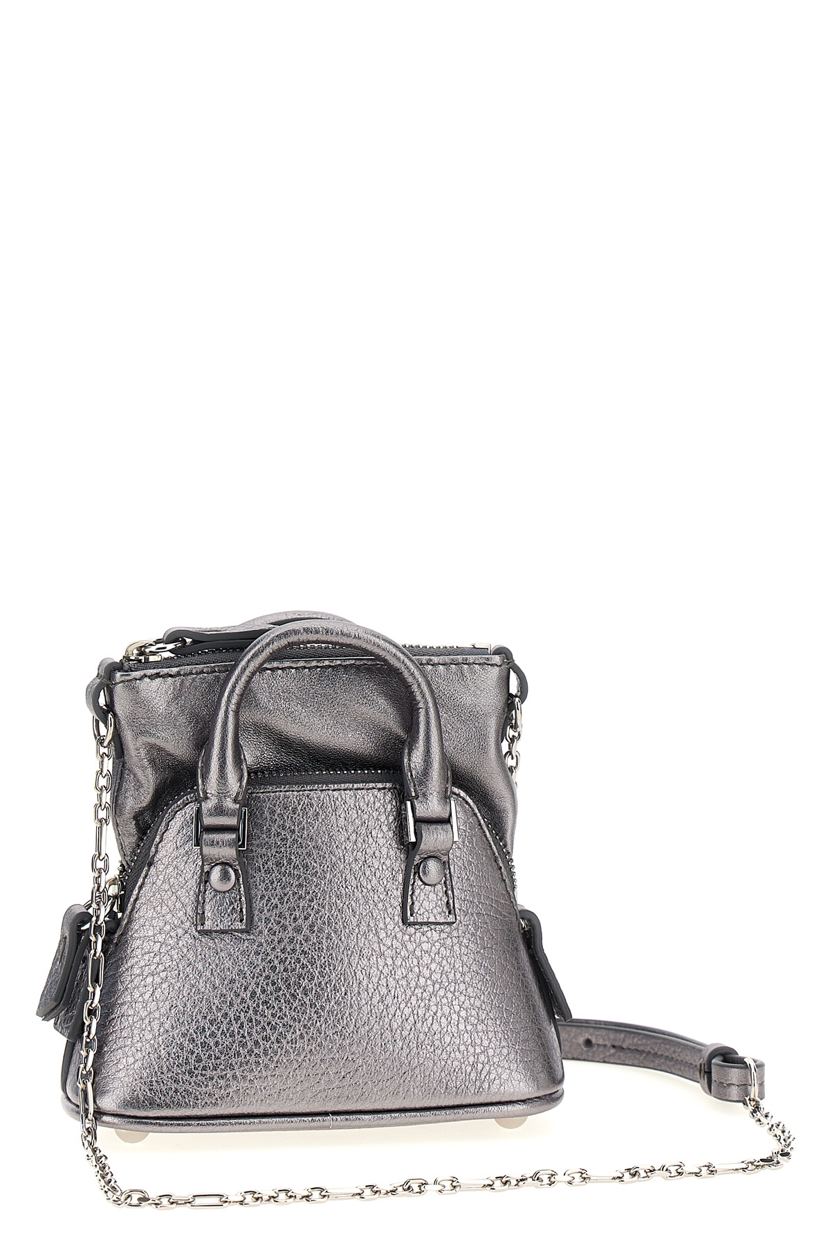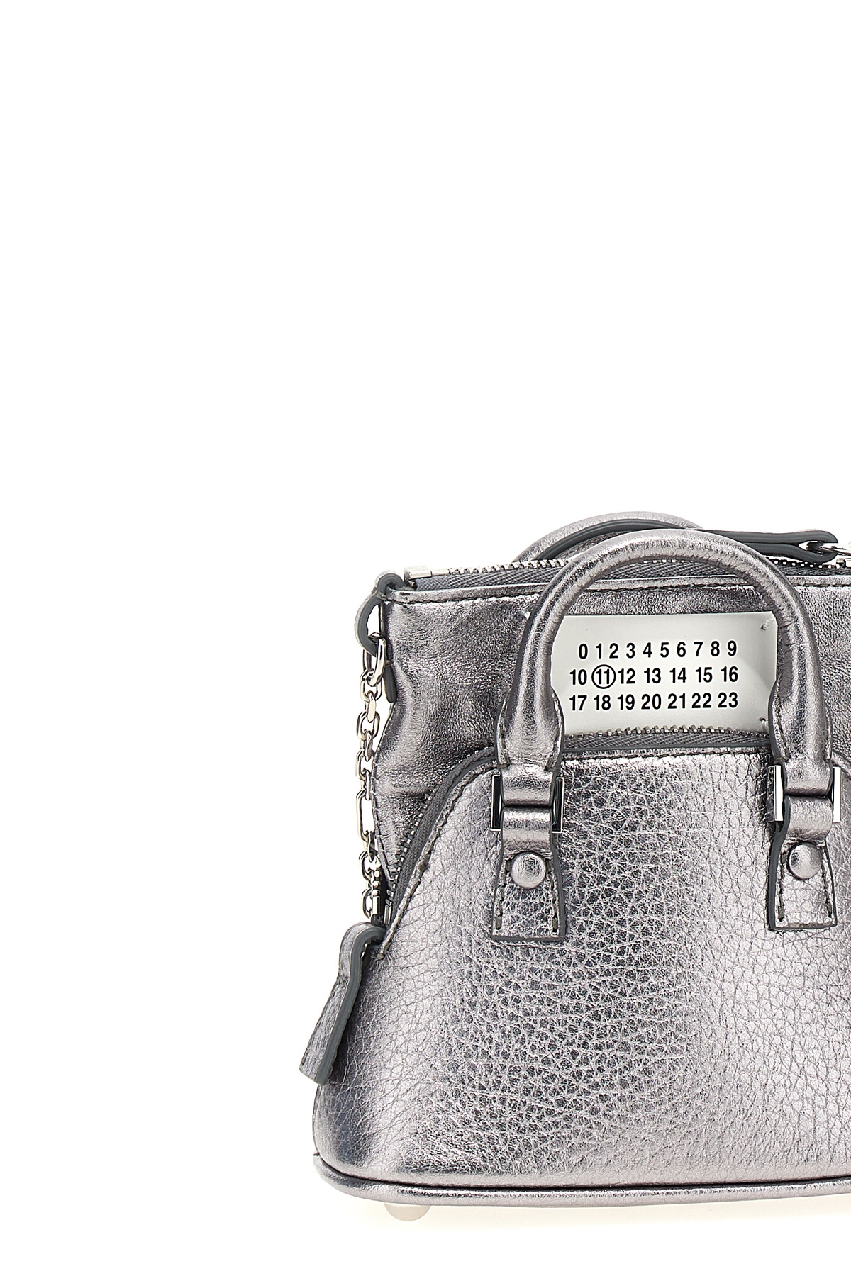 5AC classique baby hammered leather crossbody bag with top handles, chain shoulder strap, front logo label, and zipper closure.