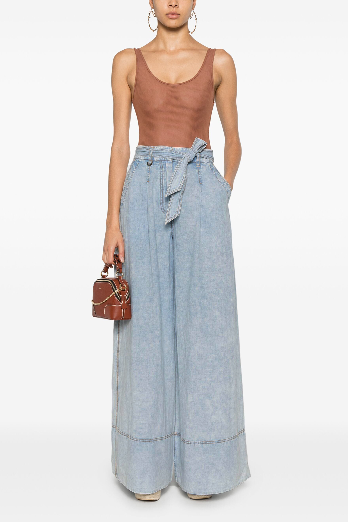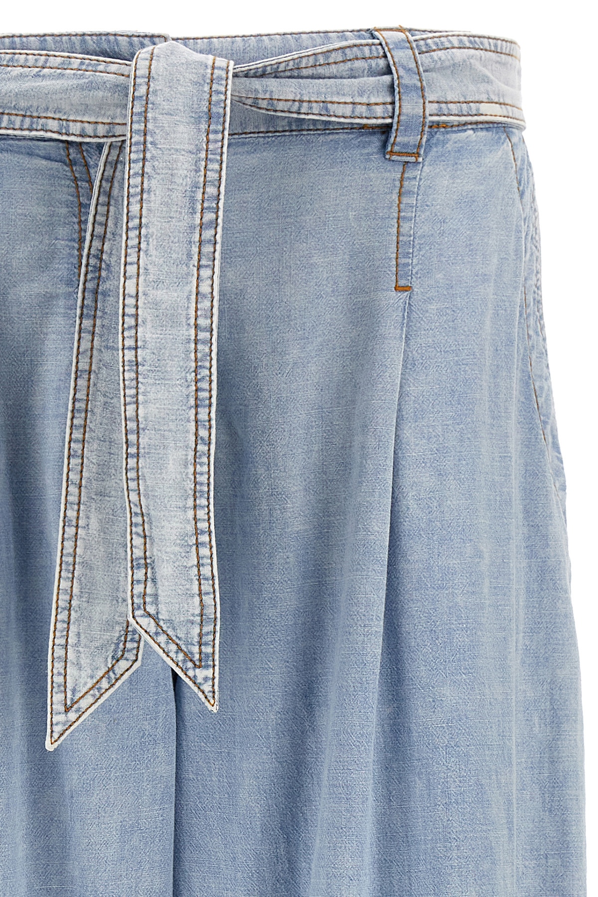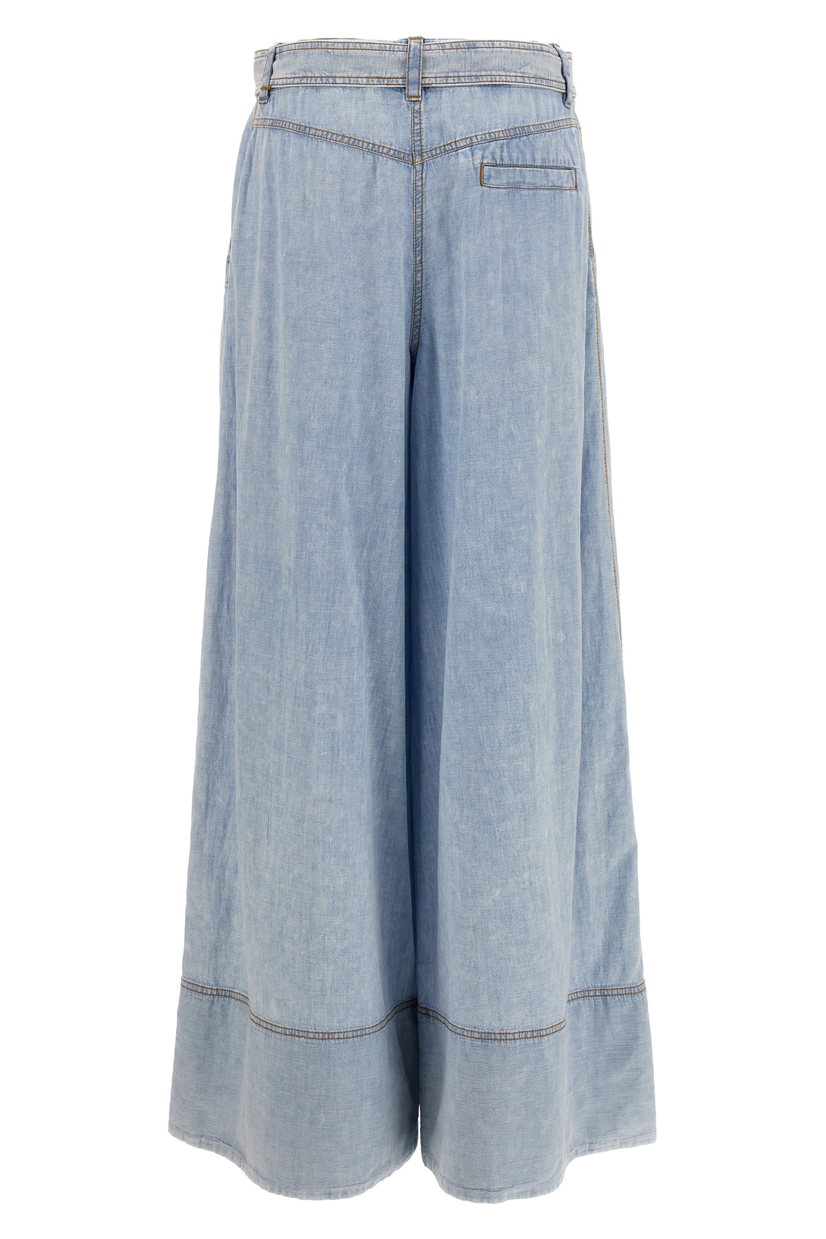 'Wide leg denim' cotton jeans with front front pleats, pockets, zip, button and belt closure, contrast stitching.