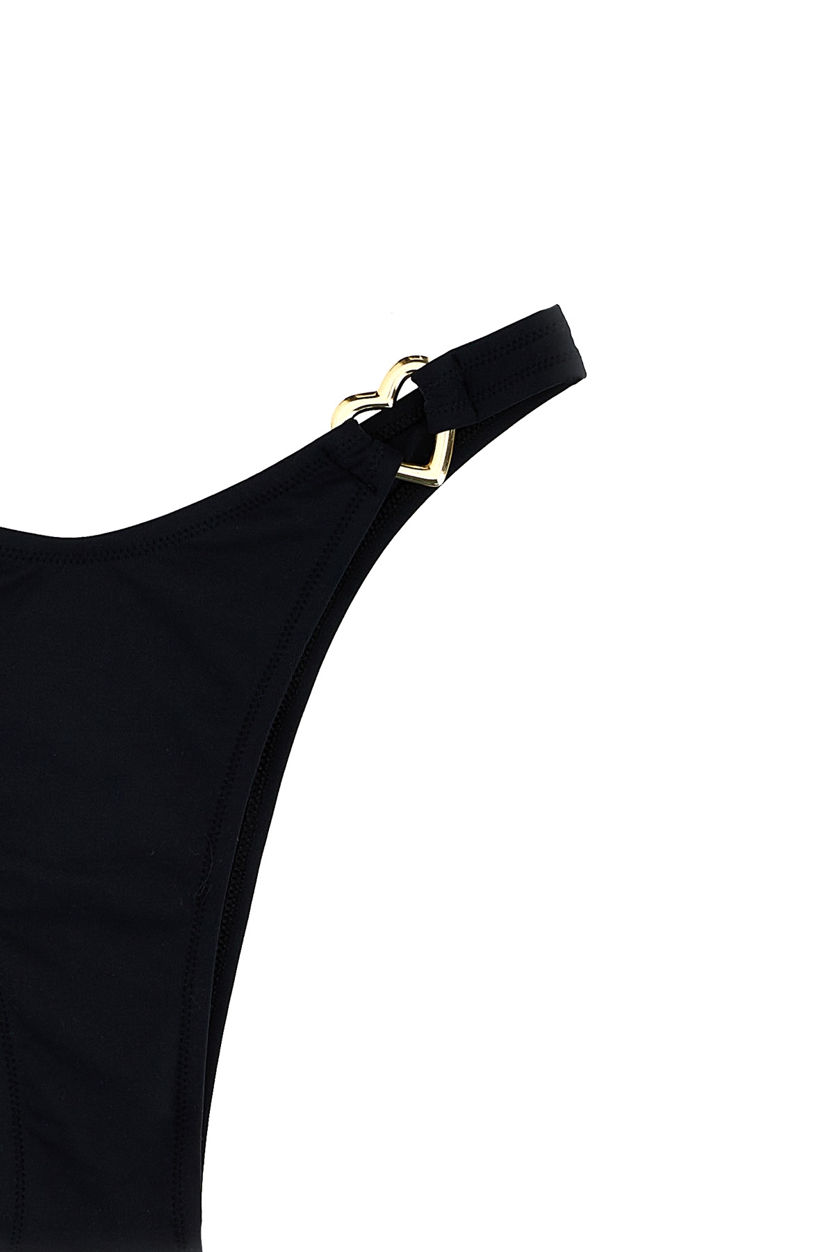 Rotate Birger Christensen x Reina Olga bikini in stretch fabric with balcony top with underwire, adjustable neck and hook at the back, and high-cut bottoms with heart-shaped metal details on the sides.