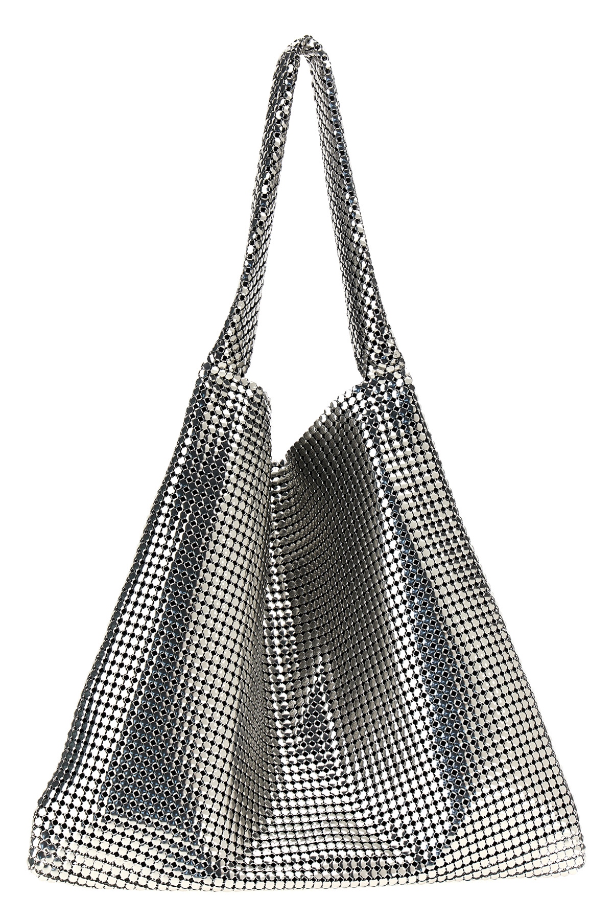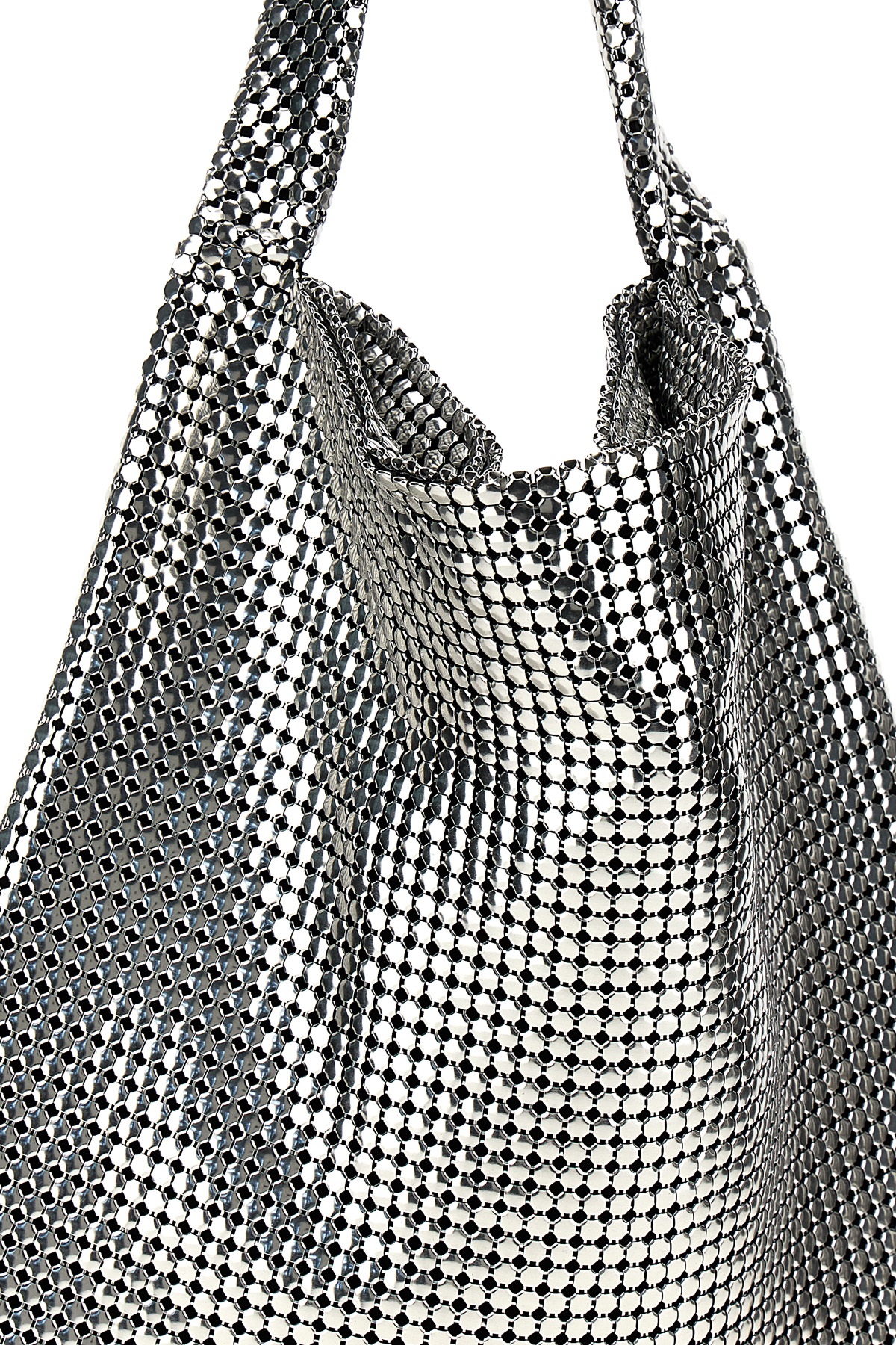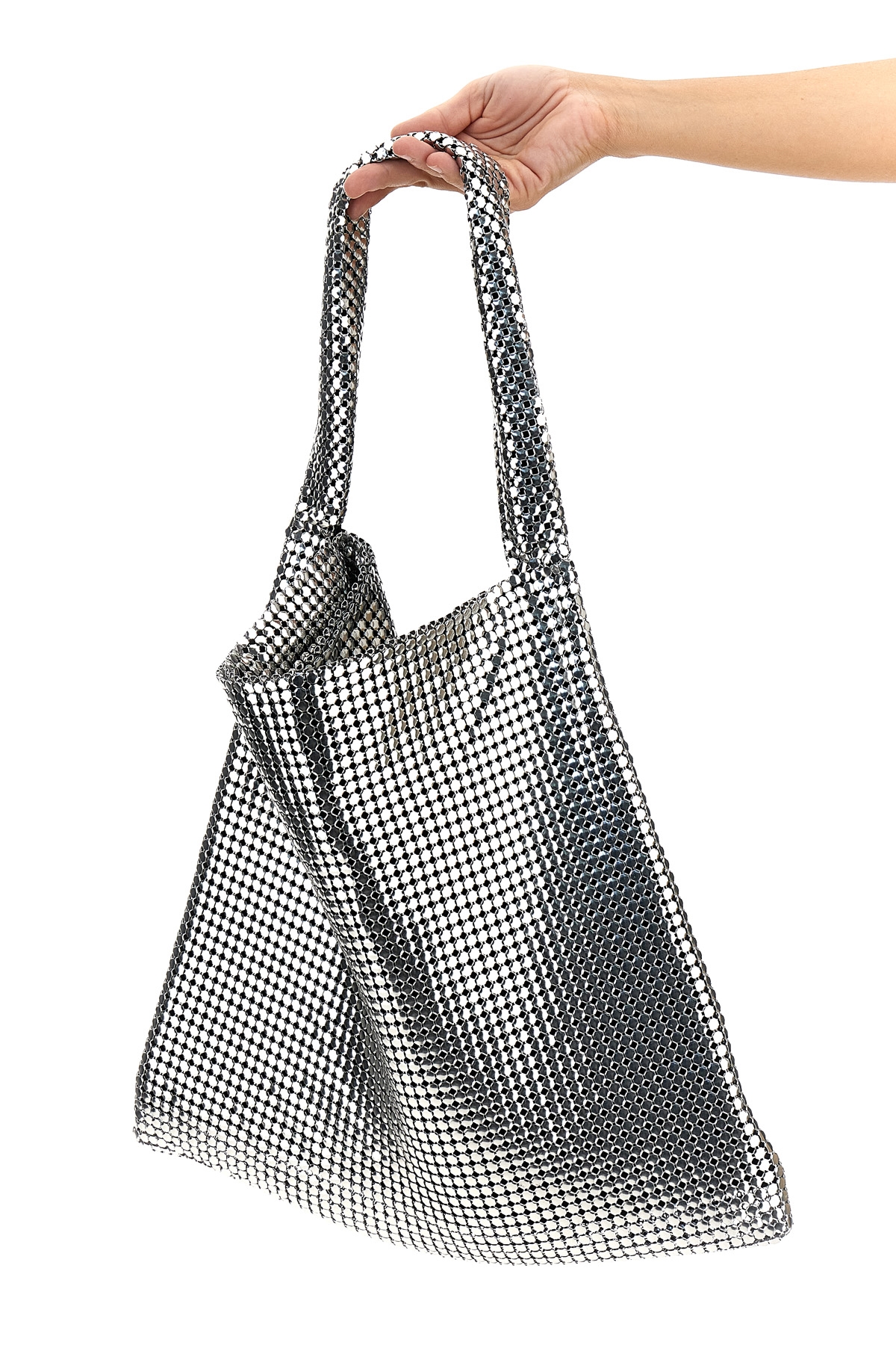 'Silver Pixel Metallic' metal mesh shopping bag with lined interior, fixed handle, snap button closure.