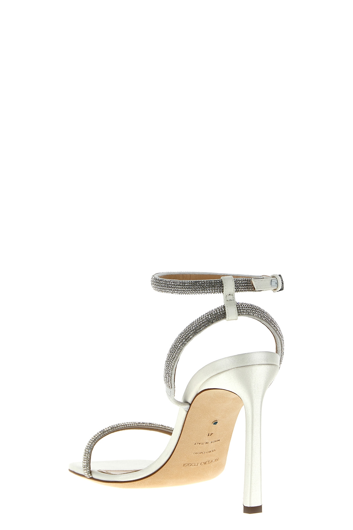 'Bridal' satin sandals with rhinestone applique, ankle strap, heel.