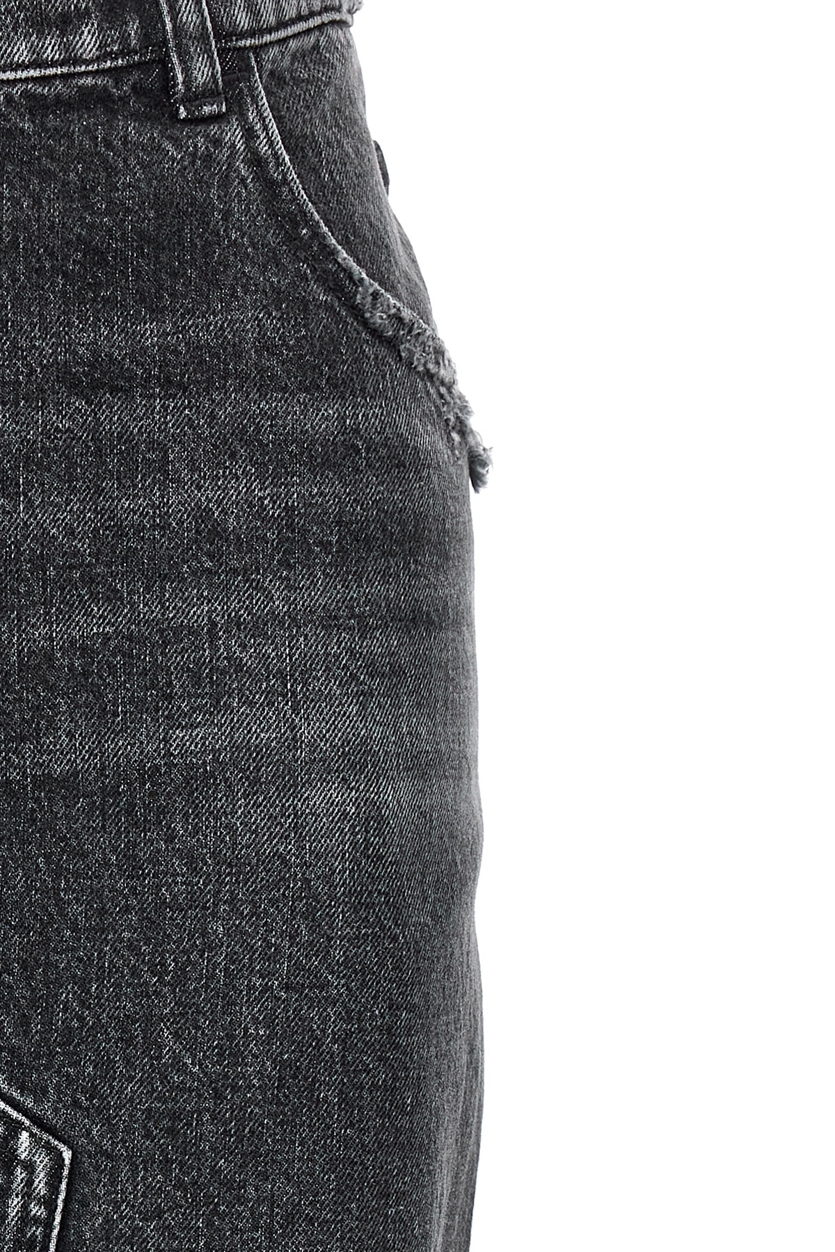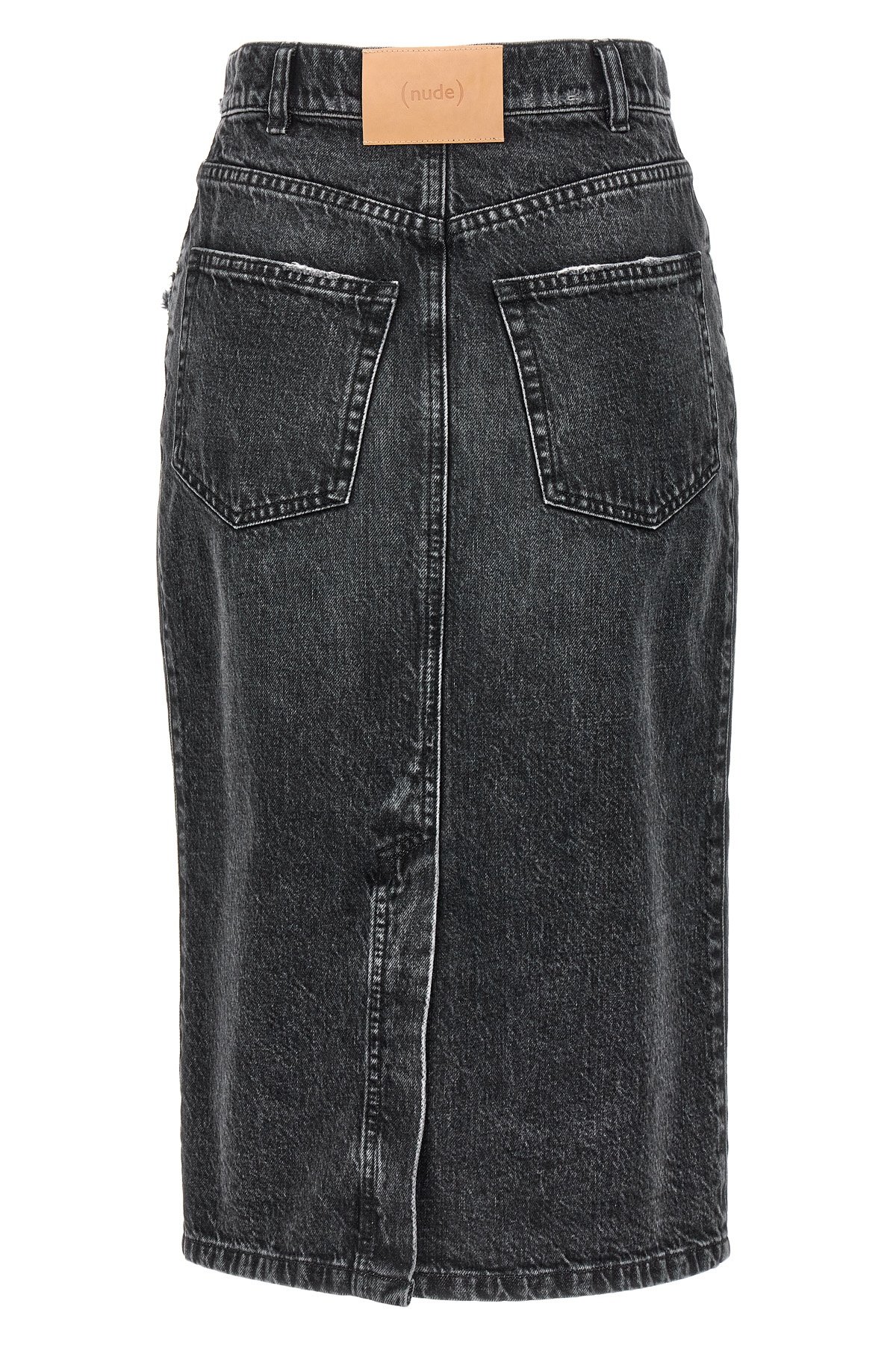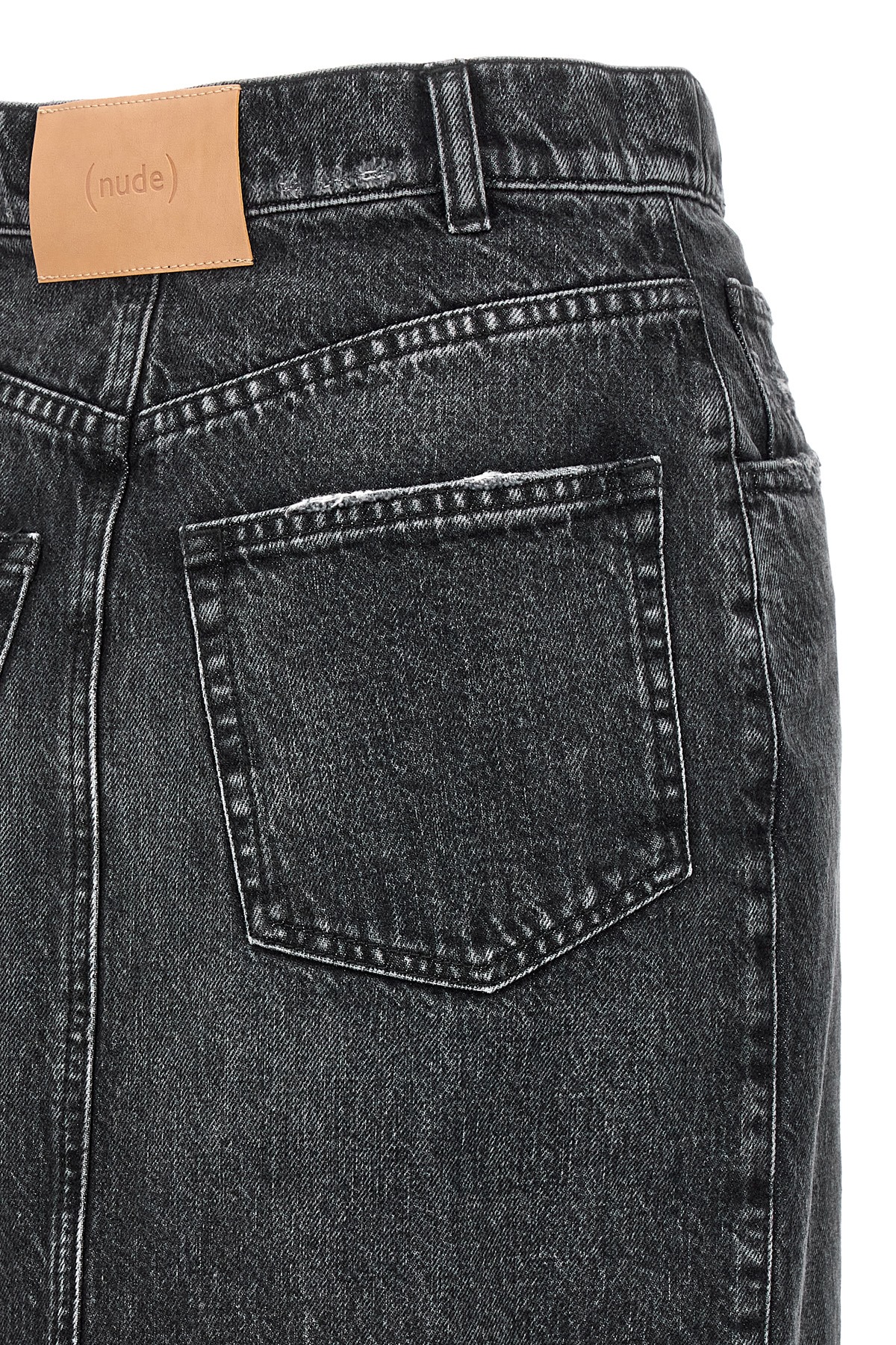 Midi skirt in cotton denim with distressed details, zip and button closure, five pockets, leather logo tag.