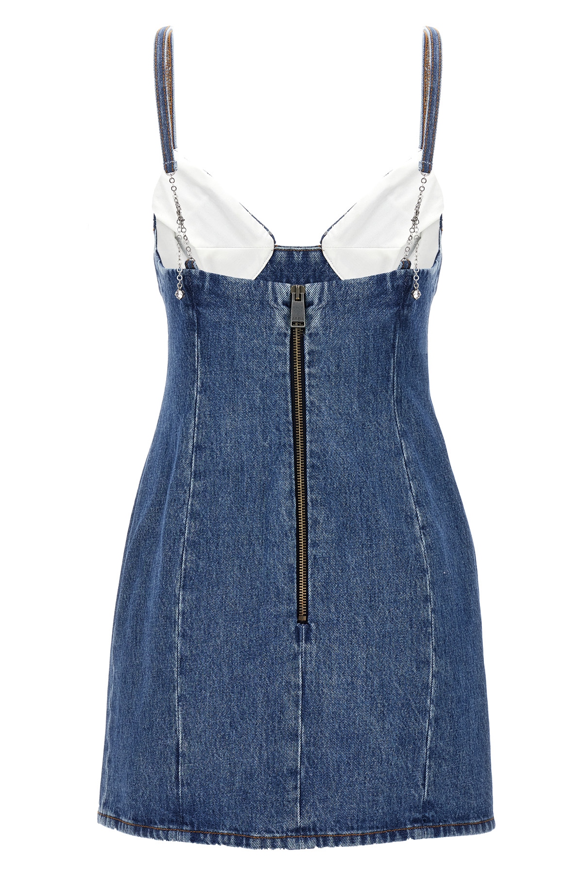 'Crystal Embellished Cup' dress in cotton denim with rhinestone application on cups, thin straps with adjustable metal detail, back zip closure.