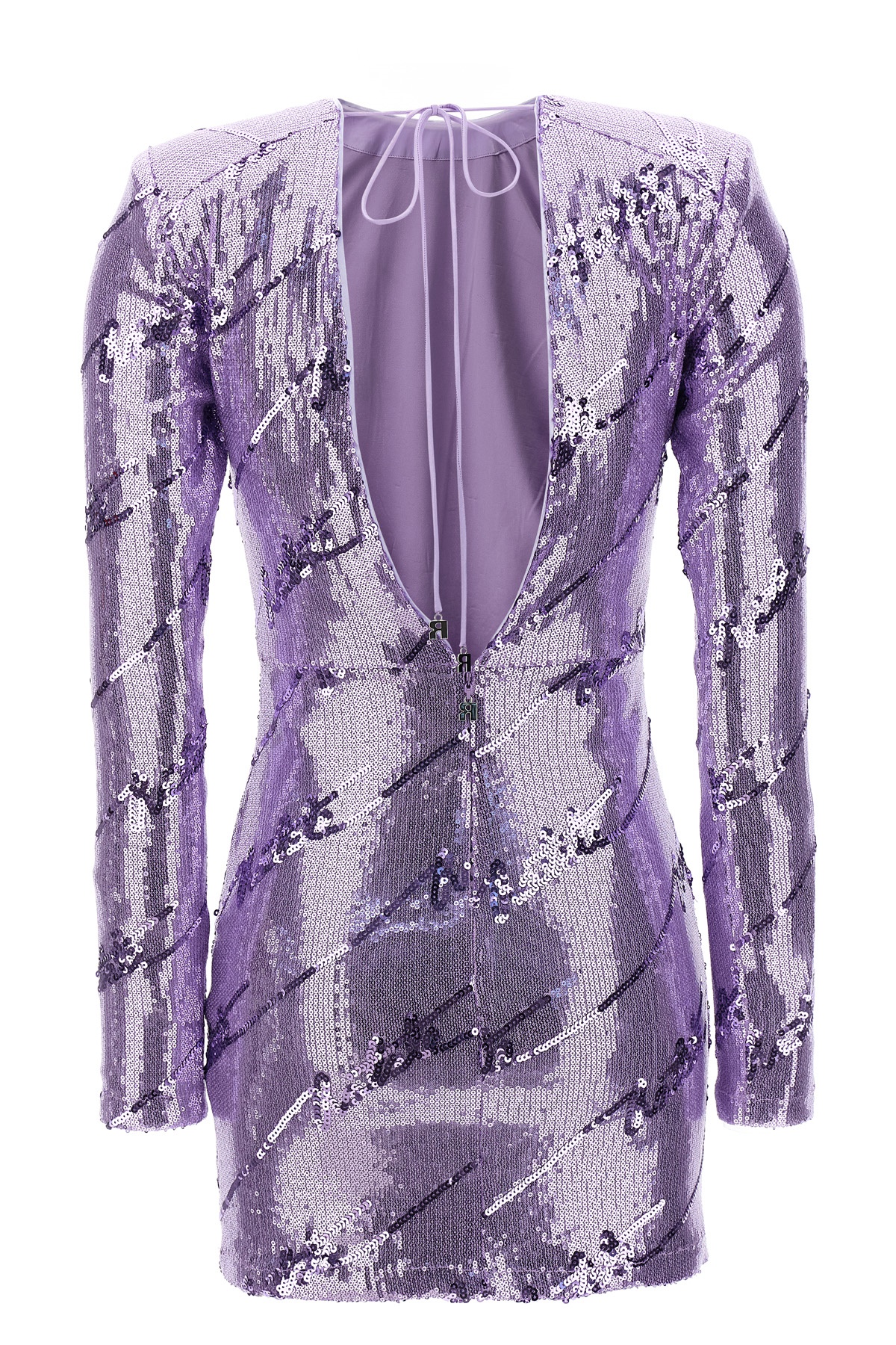 Mini dress in stretch fabric with all-over sequins, long sleeves, padded shoulders and a neckline on the back.