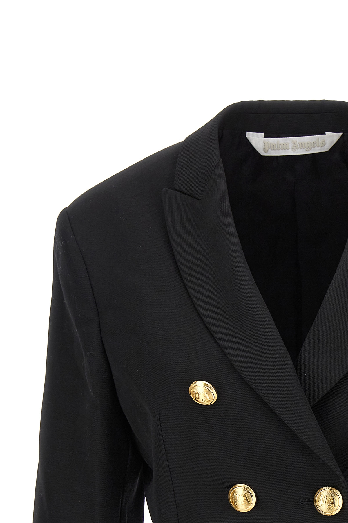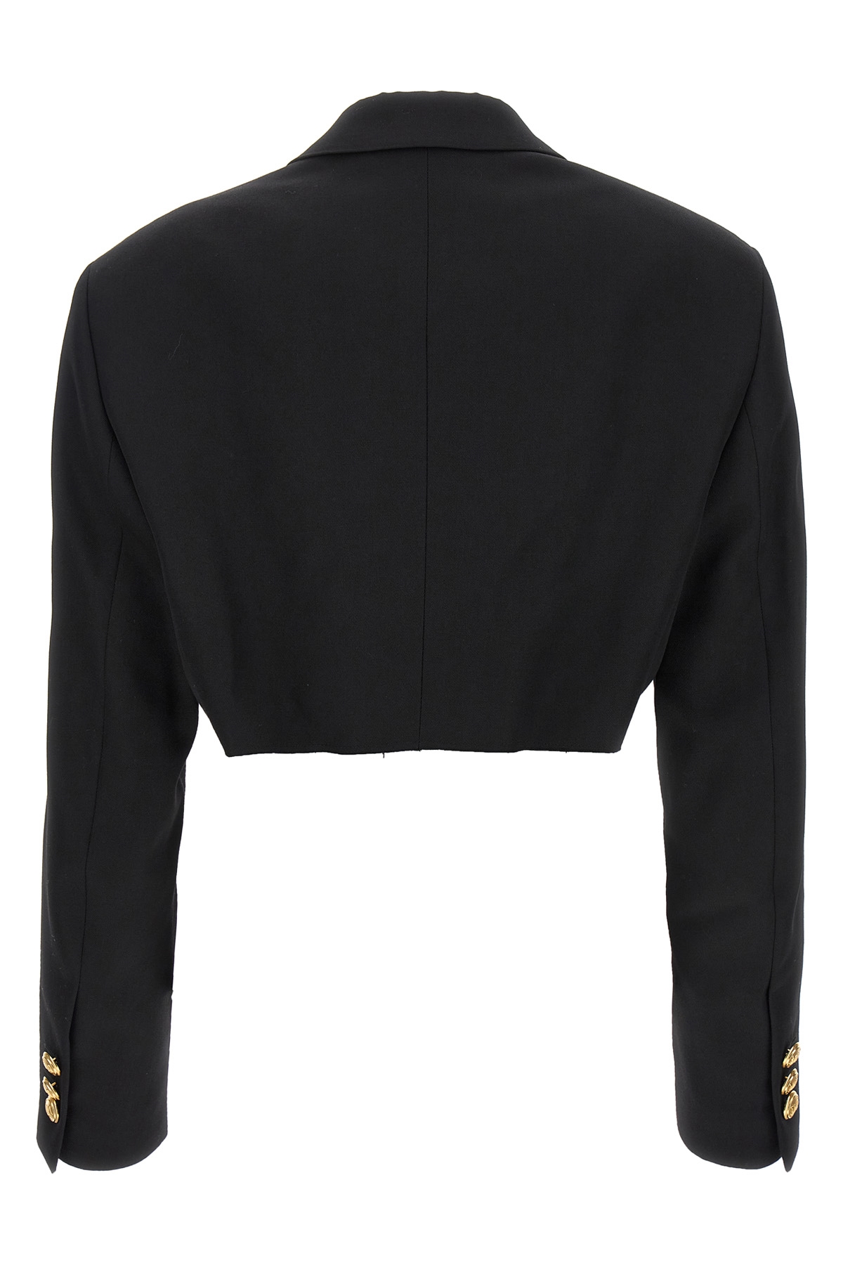 Double-breasted cropped blazer in wool blend with gold buttons.