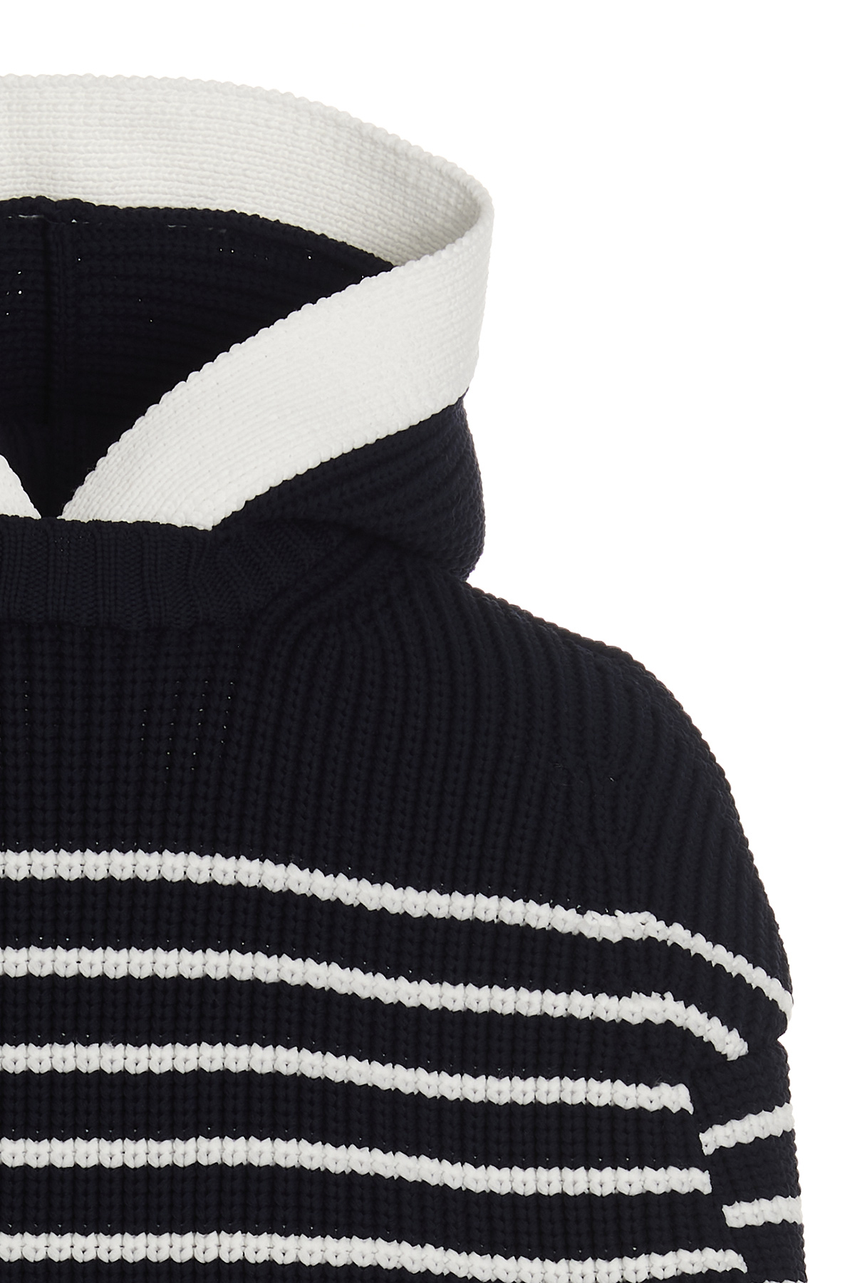 Striped knit hooded cape with kangaroo pocket and an arm hole.