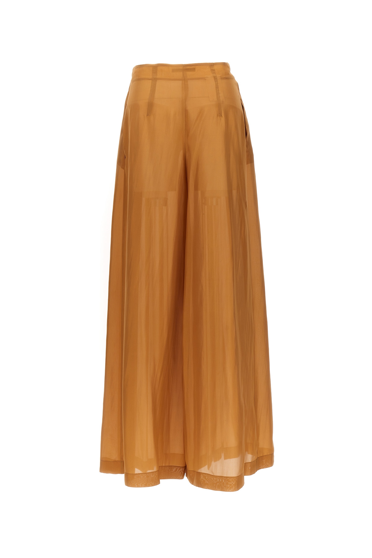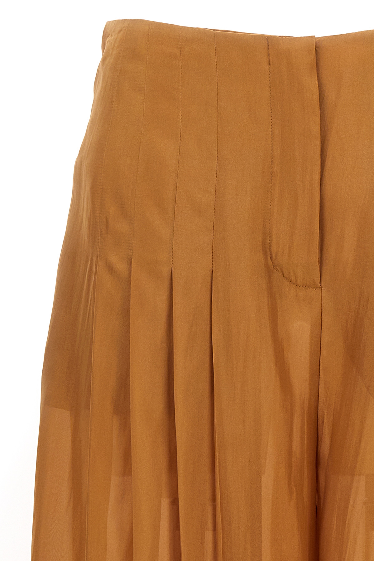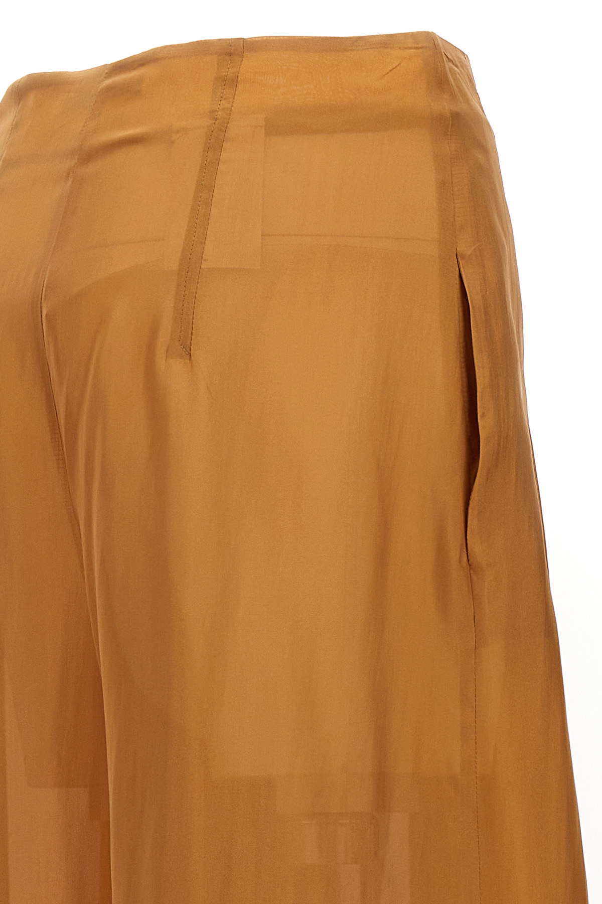Pleated silk pants with zip and button closure and a loose leg.