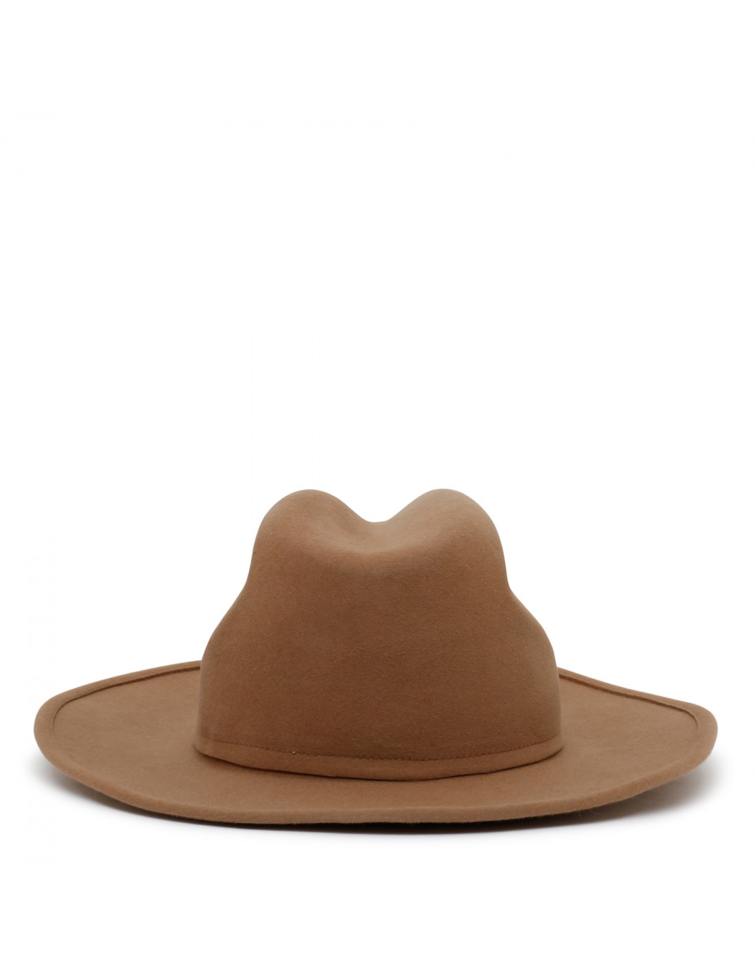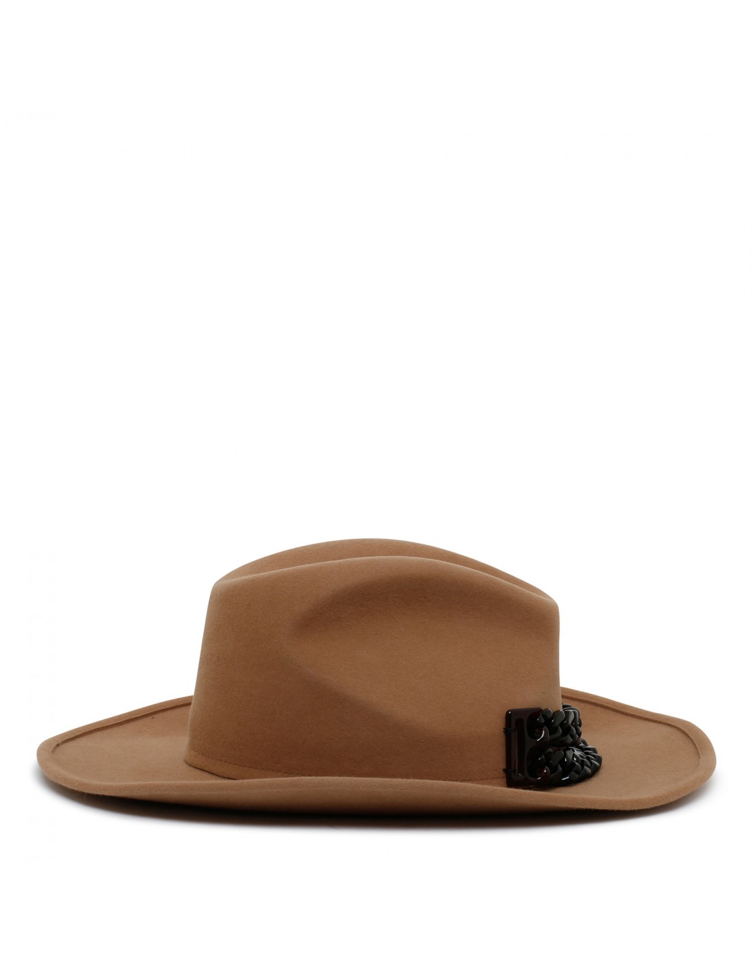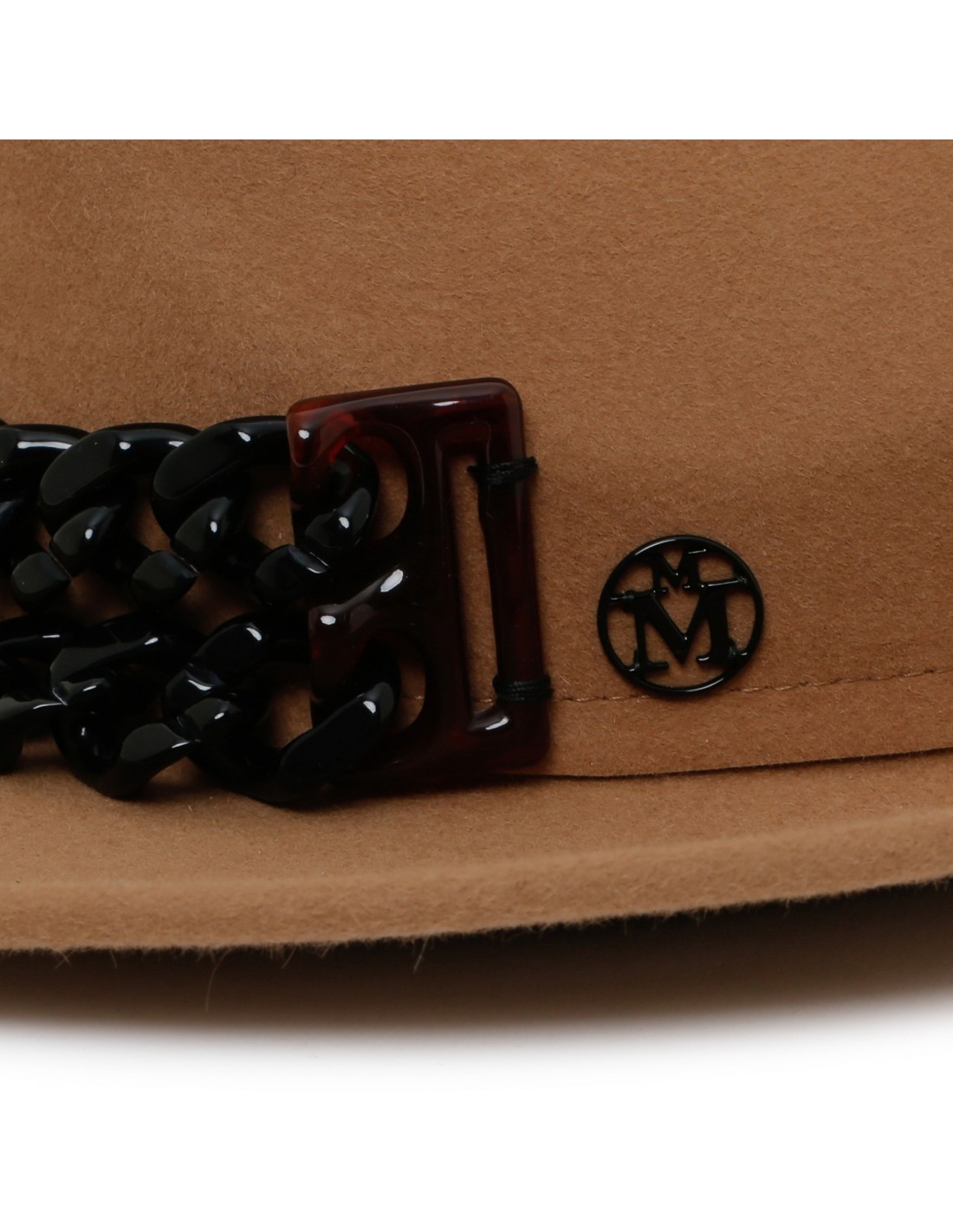 Camel rabbit felt fedora hat from Maison Michel featuring black acetate chain applique, black laquered Maison Michel logo, internal loop.