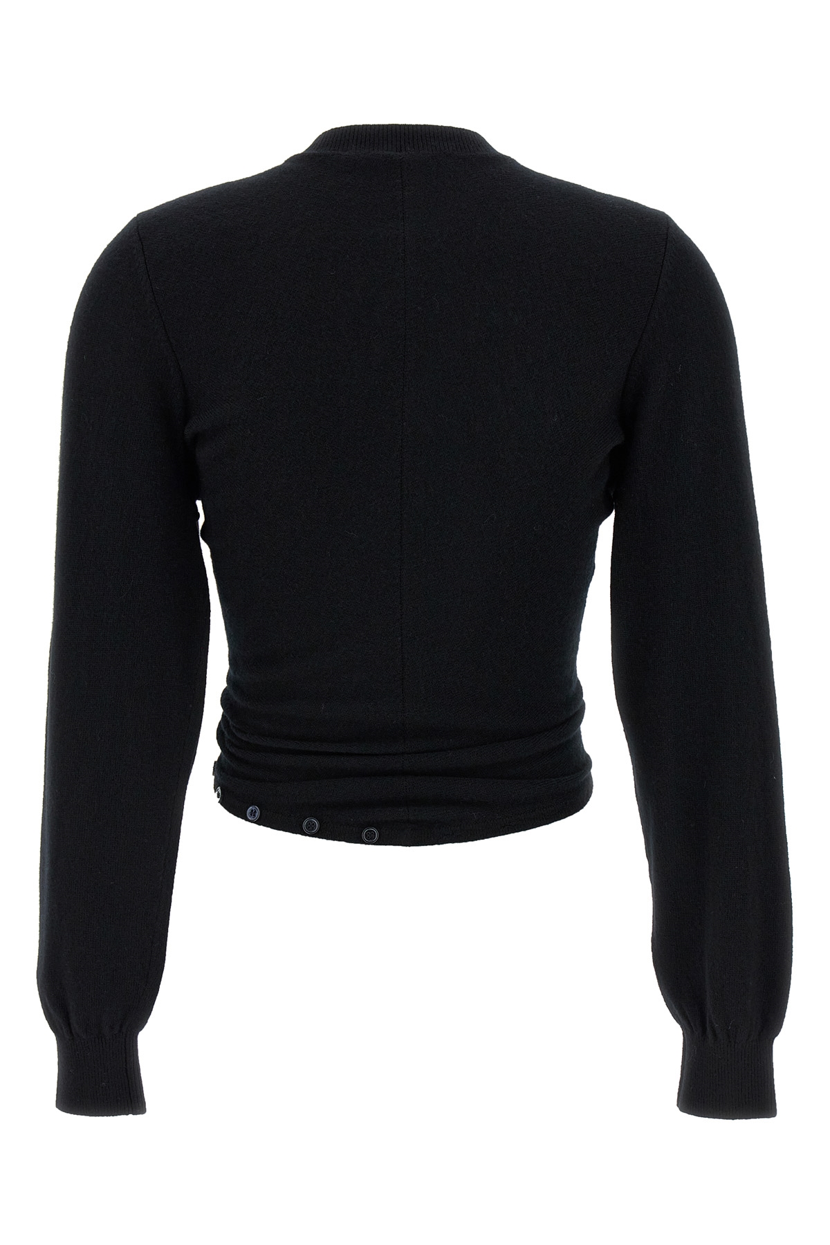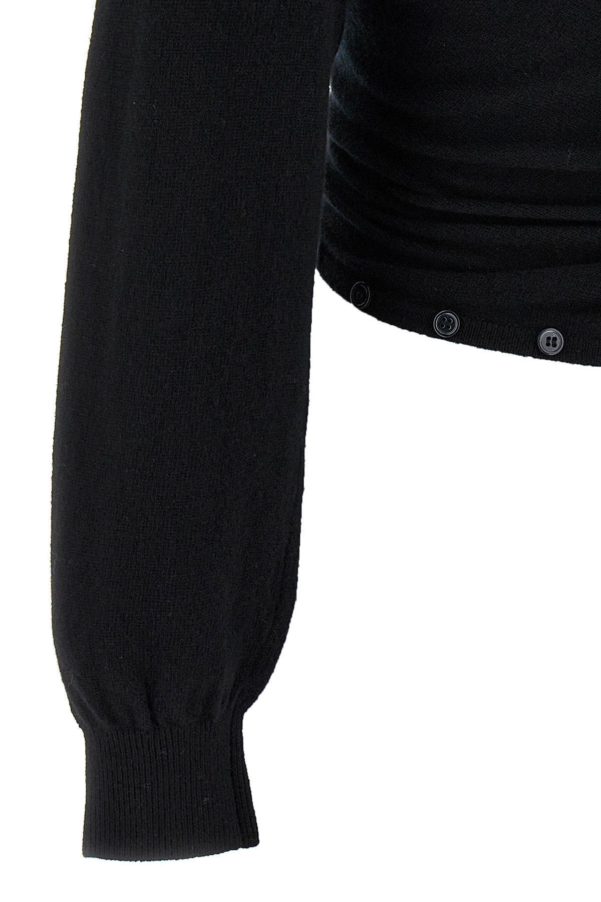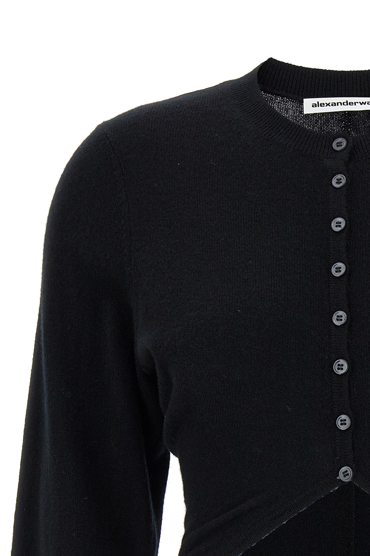'LS' asymmetrical wool cardigan with pointed hem, crew neck, long cuffed sleeves.