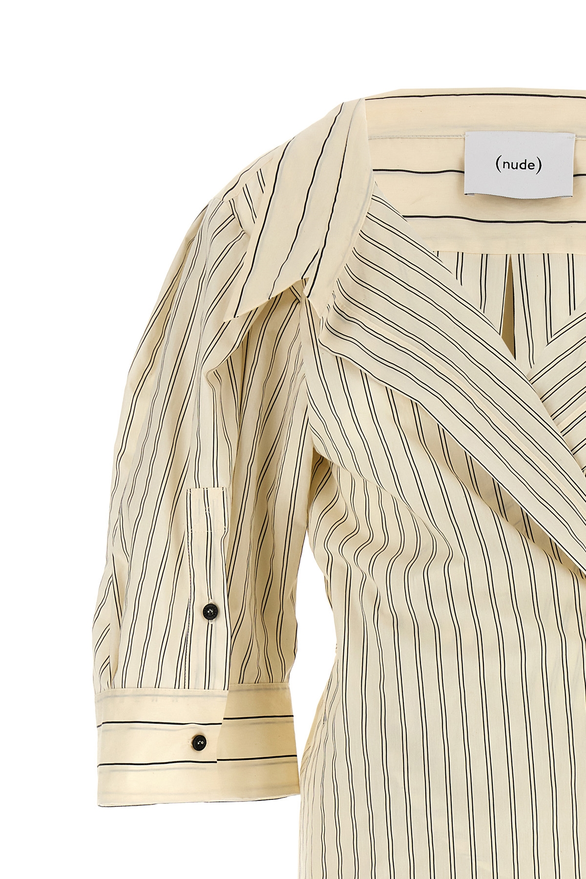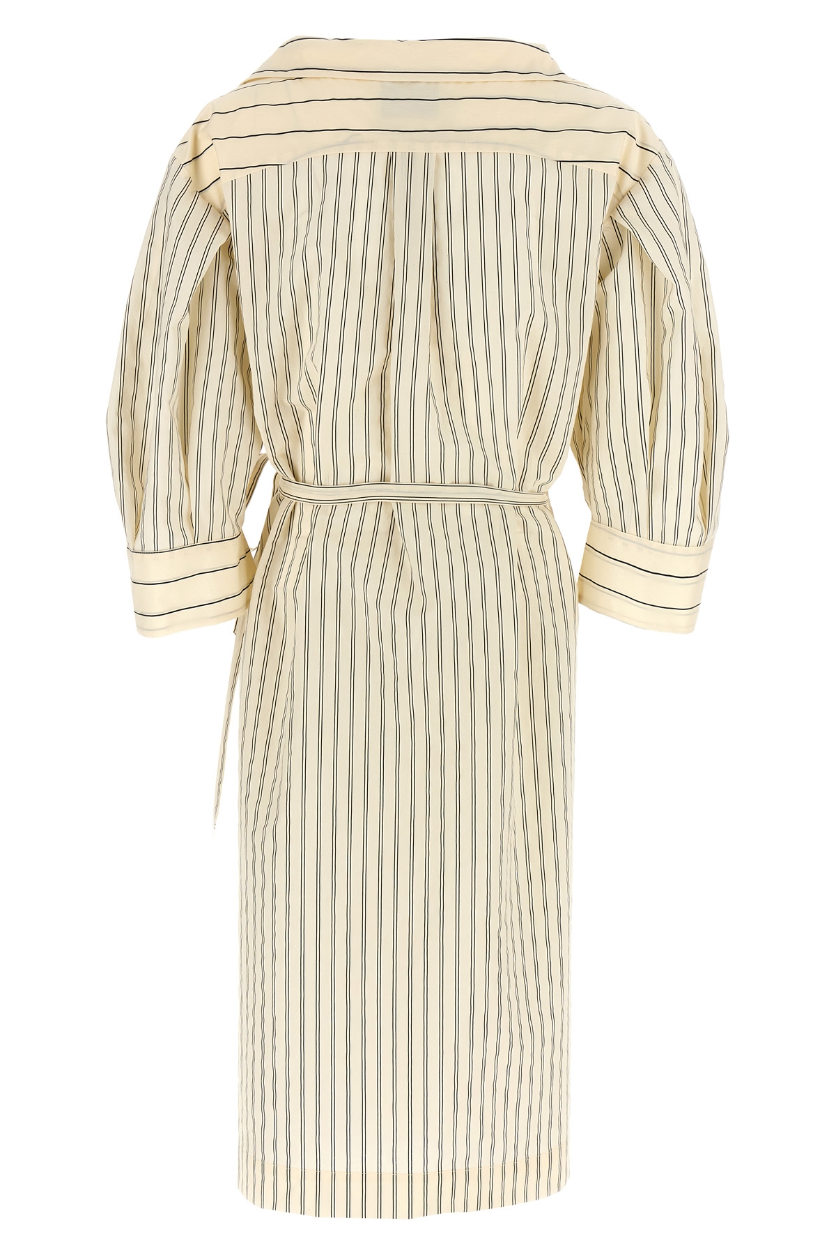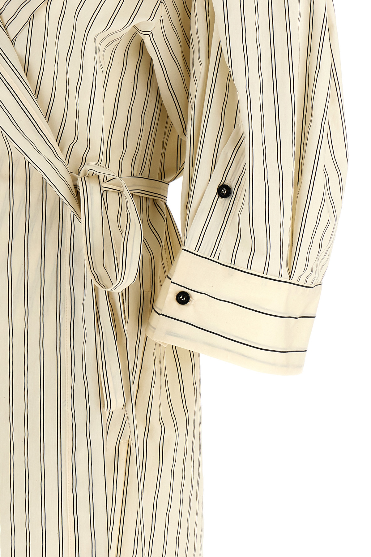 Striped cotton blend shirt dress, wrap closure with waist tape, pockets, long and wide cuffed sleeves.
