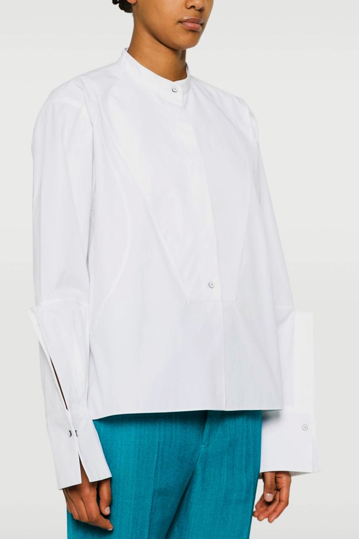 '69' cotton shirt with button closure, mandarin collar, long sleeves, maxi button cuffs.