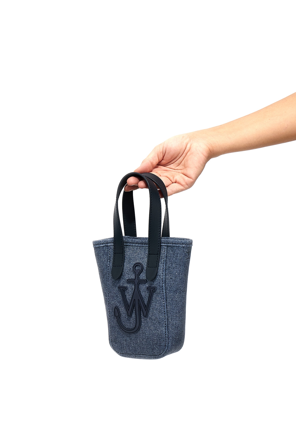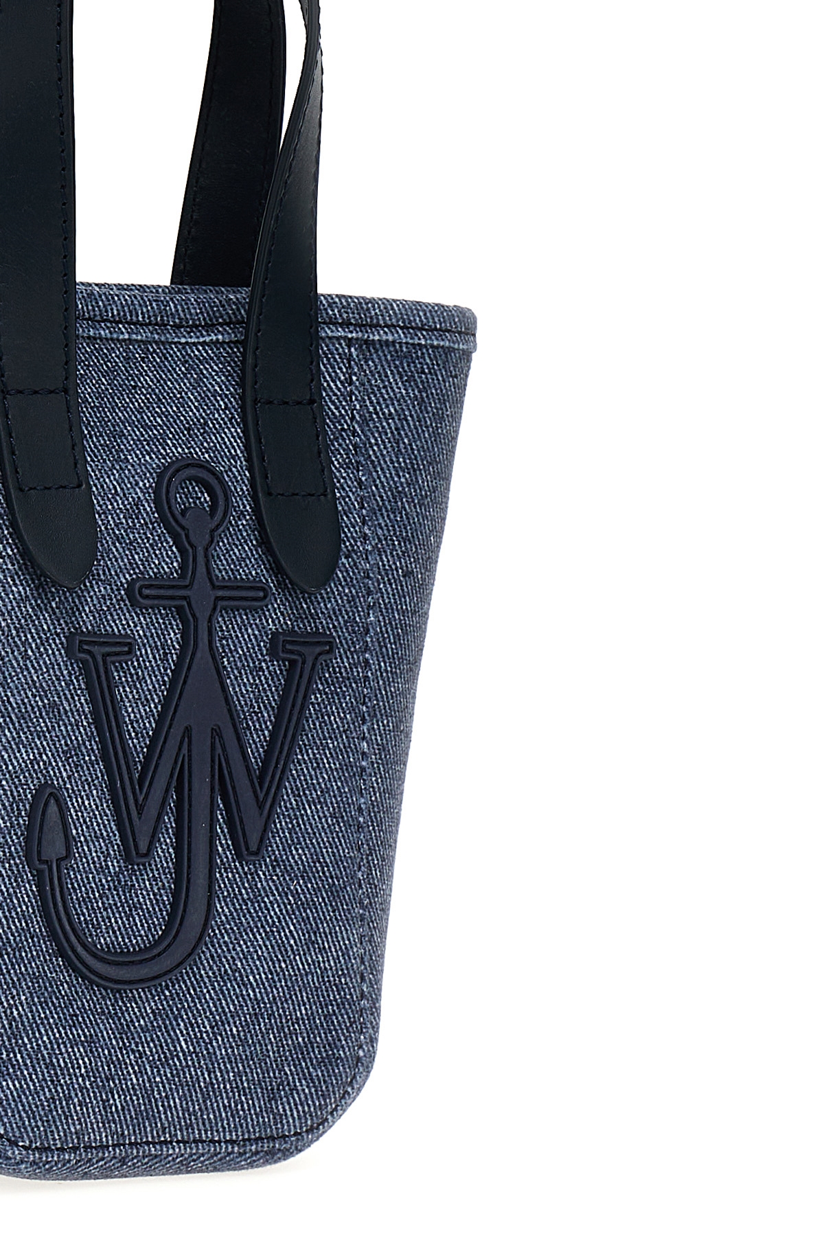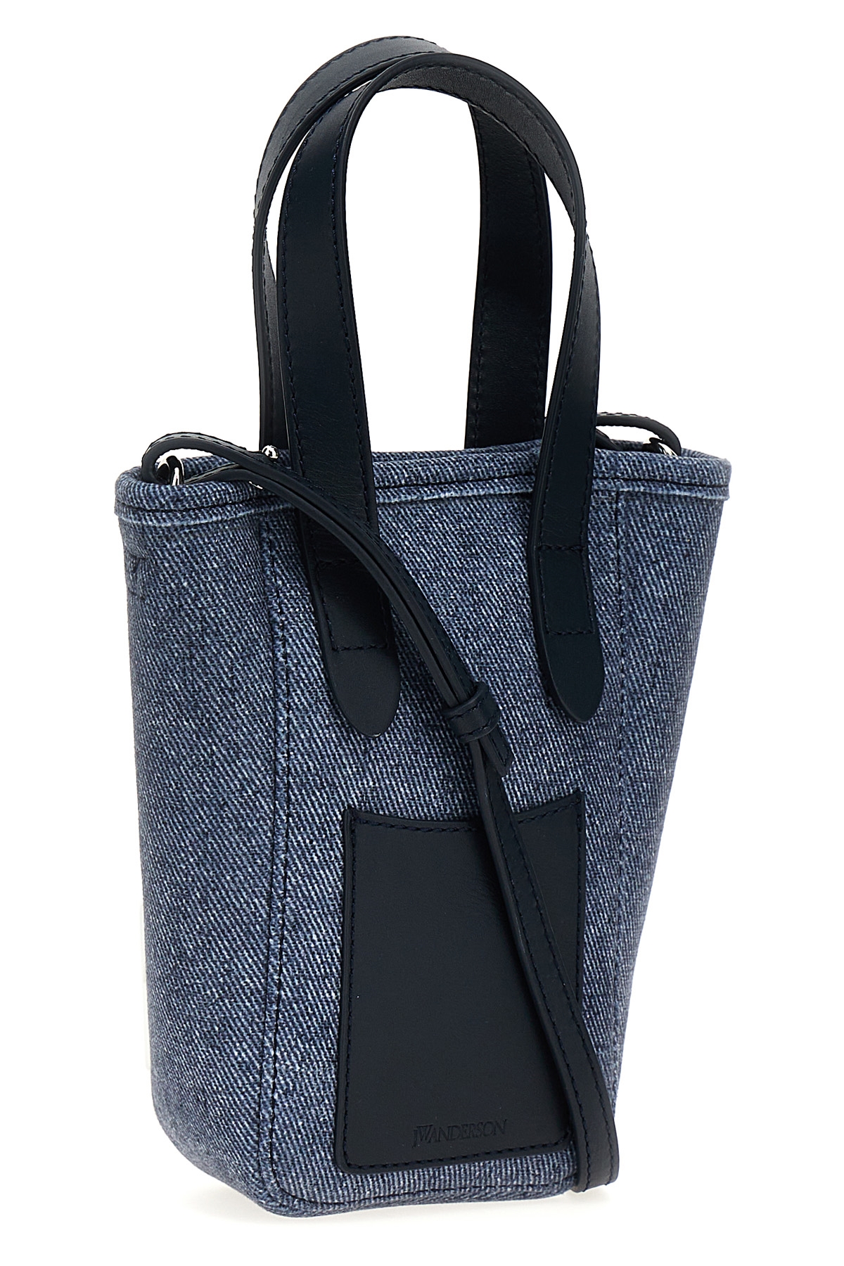 'Mini Belt' denim-effect printed velvet shopping bag with front rubber logo, double handle, adjustable and removable leather shoulder strap, and lacing closure.