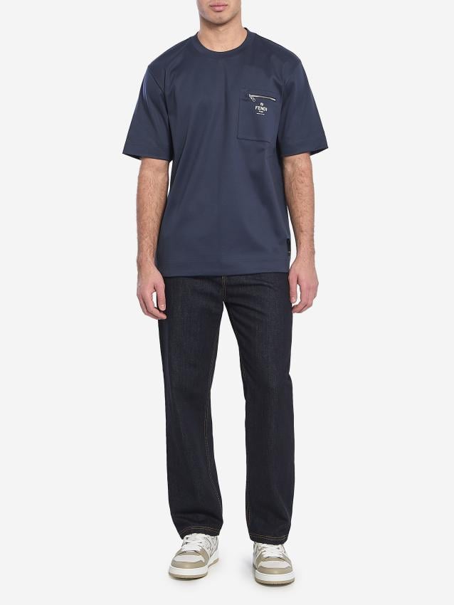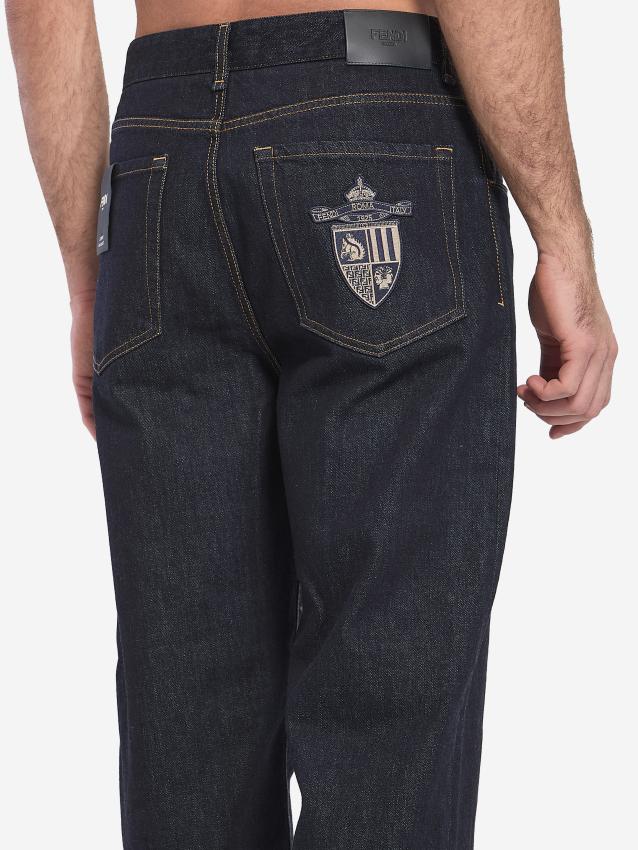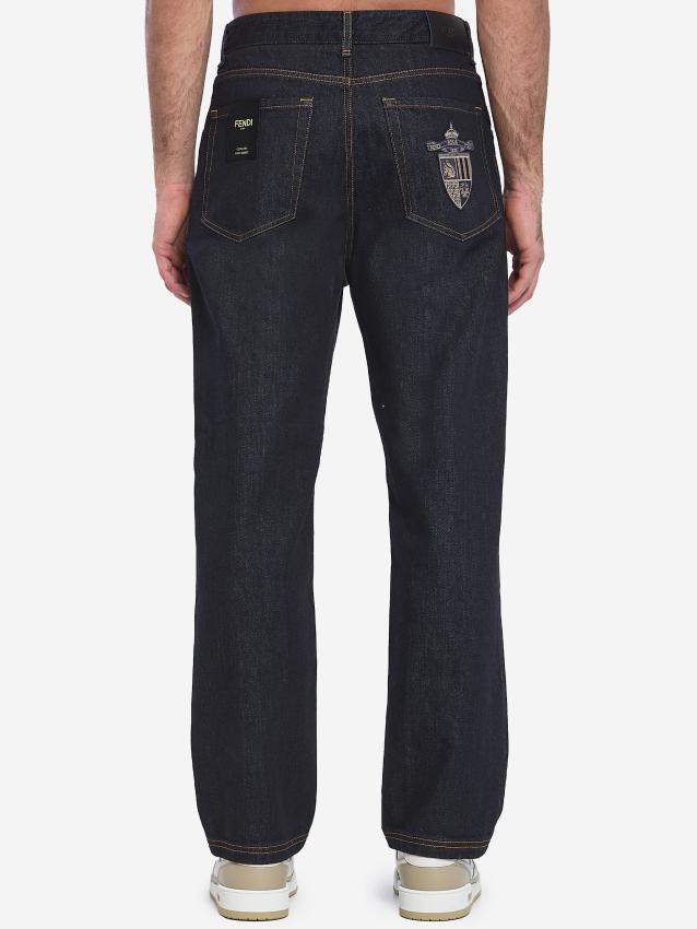 Straight-leg jeans in dark blue cotton denim with contrast stitching. They feature a button and zip closure, belt loops, five pockets, straight legs,
