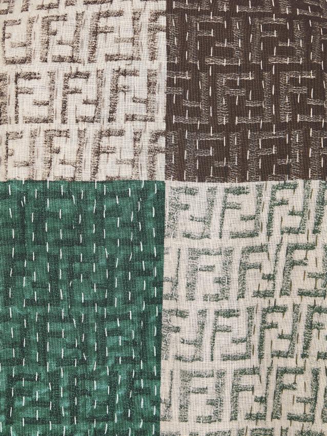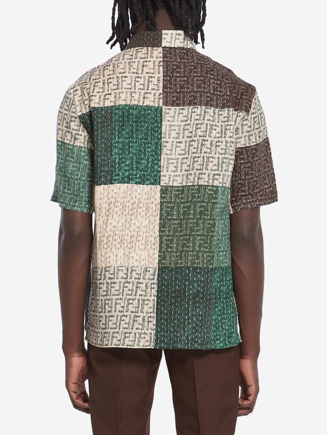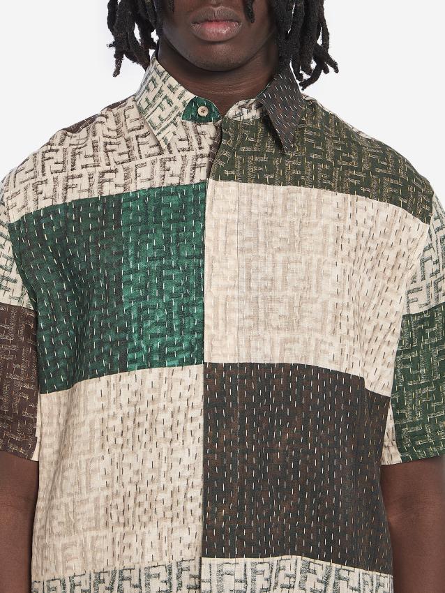 Short-sleeve FF linen shirt in patchwork shades of brown and green. It features a pointed collar and front button closure. Regular fit.The model is