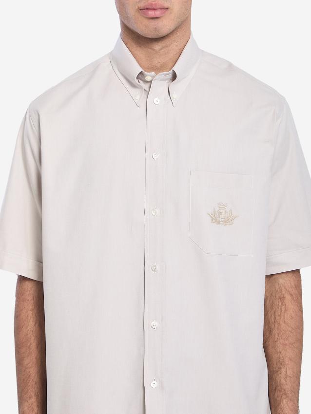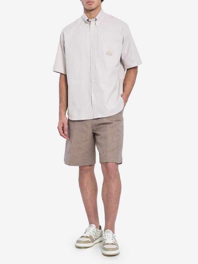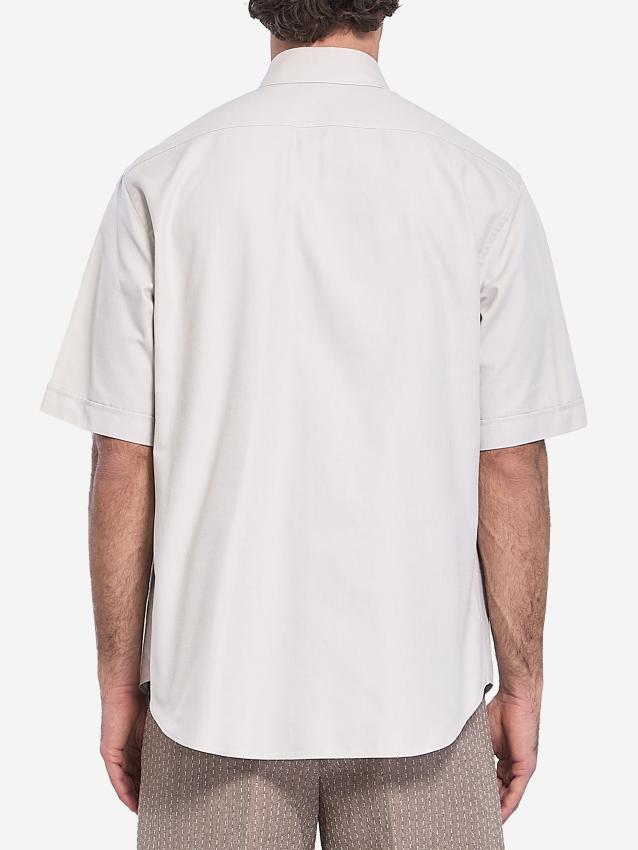 Short-sleeved shirt in light beige cotton Oxford. It features a button-down collar, a front button closure, a chest pocket with a tone-on-tone