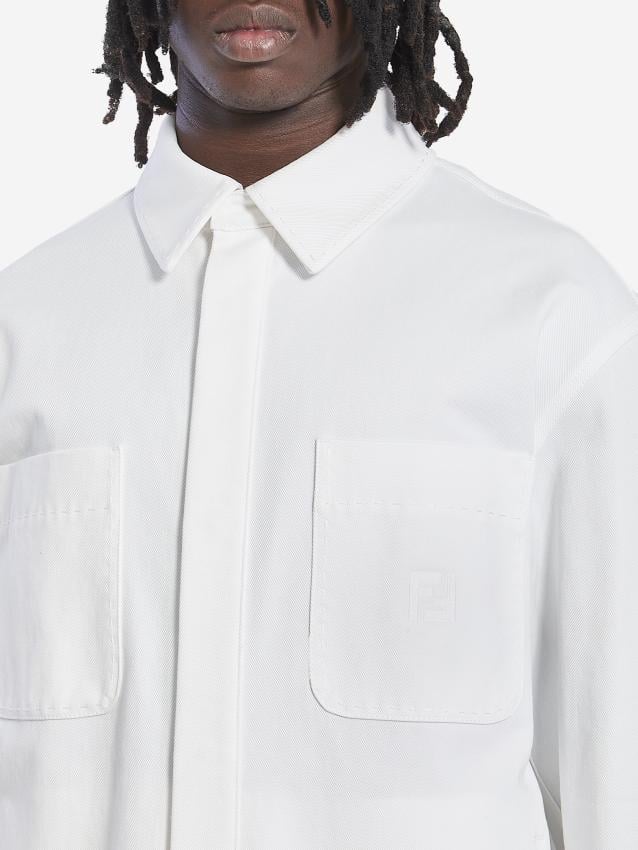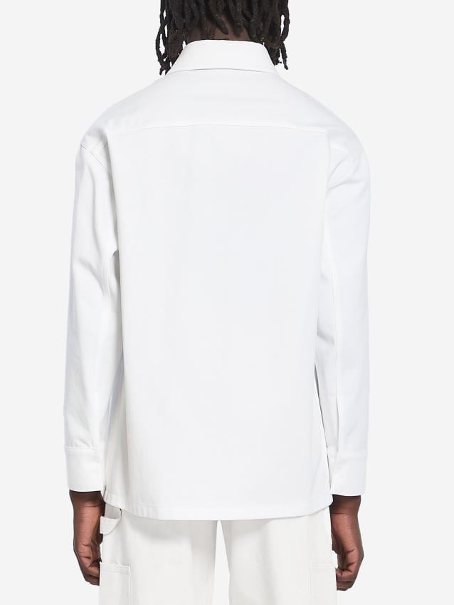 White cotton denim jacket with tonal Selleria stitching. It features a pointed collar, dropped shoulders, front snap button closure, two patch