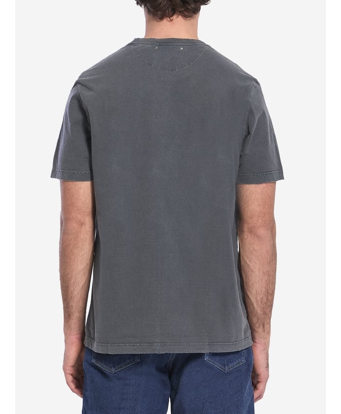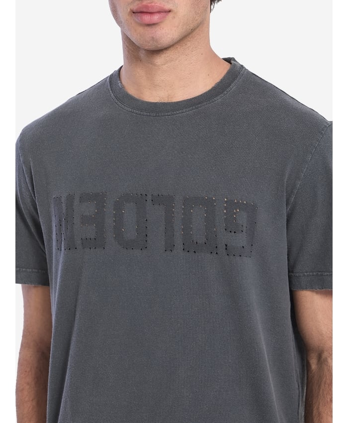 Short-sleeved crew-neck t-shirt in anthracite gray cotton with a distressed treatment. It features a distressed Golden logo upside down on the chest,