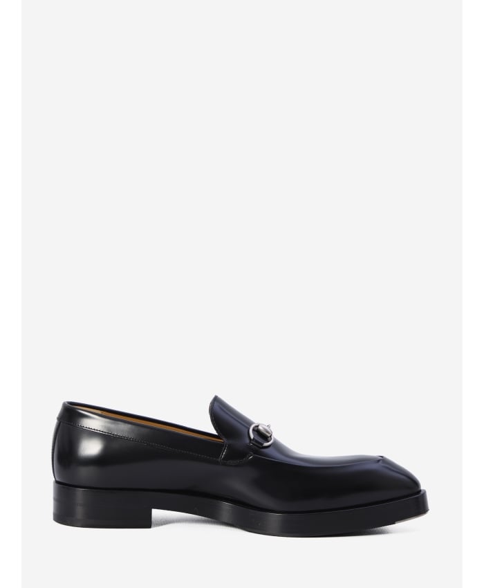 Pointed moccasins in black leather. They feature a buckle on the upper, an insole with an engraved logo, a leather sole with rubber lining, and a