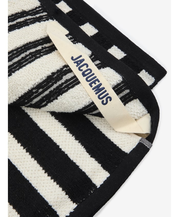 Rayures beach towel in striped black and white cotton-linen terry blend. It features a front label with a white embroidered logo and an ivory