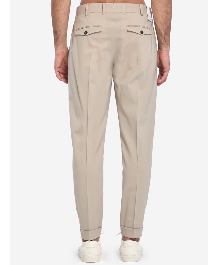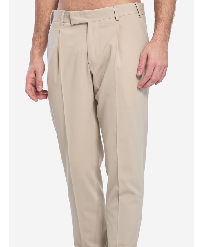 Rebel trousers in beige virgin wool blend. They feature front pleats, a hook, button, and zip closure, belt loops, two side pockets, two back welt