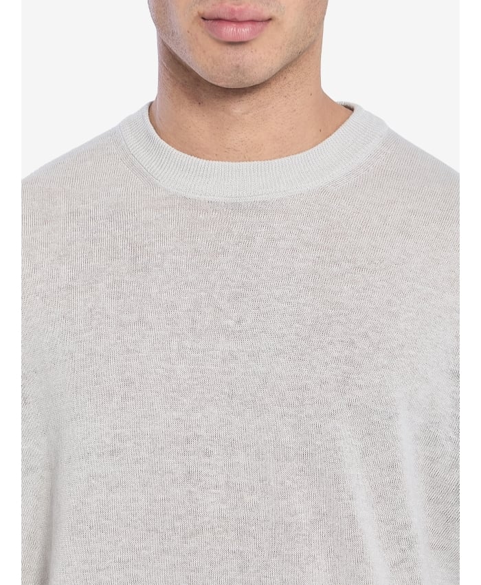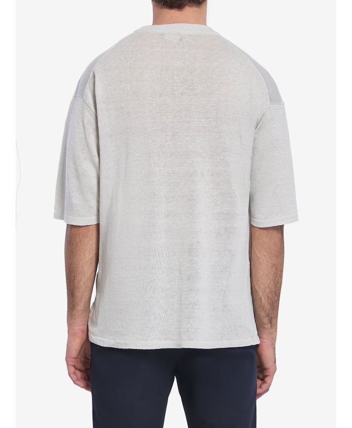 Short-sleeved crew-neck t-shirt in pearl gray linen knit. It features a ribbed crew neck.The model is 189cm tall and wears a size IT 50.