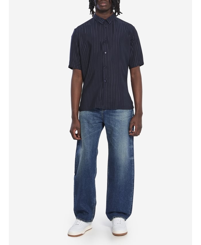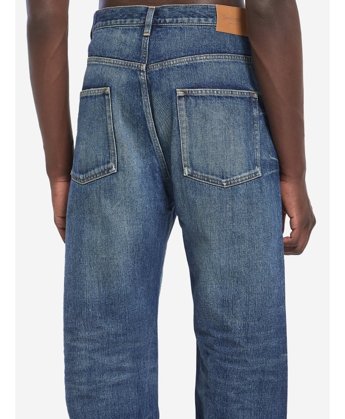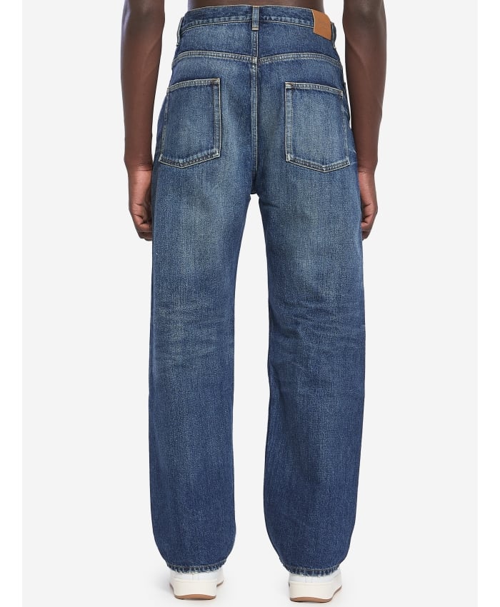 High-waisted jeans in vintage heritage blue denim. They feature a button closure, belt loops, five pockets, straight legs, and a brown leather patch