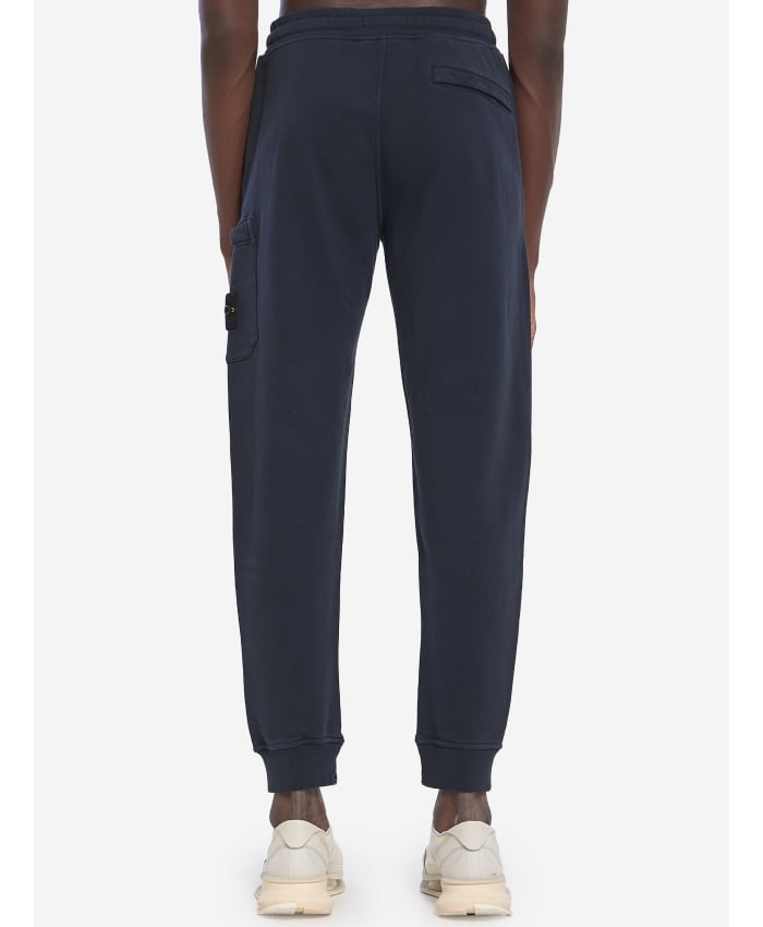 Blue organic cotton fleece jogger pants. It features an elasticated waistband with drawstrings and a zip, two side pockets, a patch pocket on the