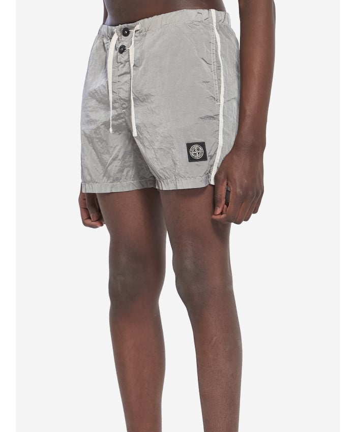Short swim trunks in light grey metallic nylon with a mesh inner lining. They feature an elasticized waistband with drawstring, button closure, two