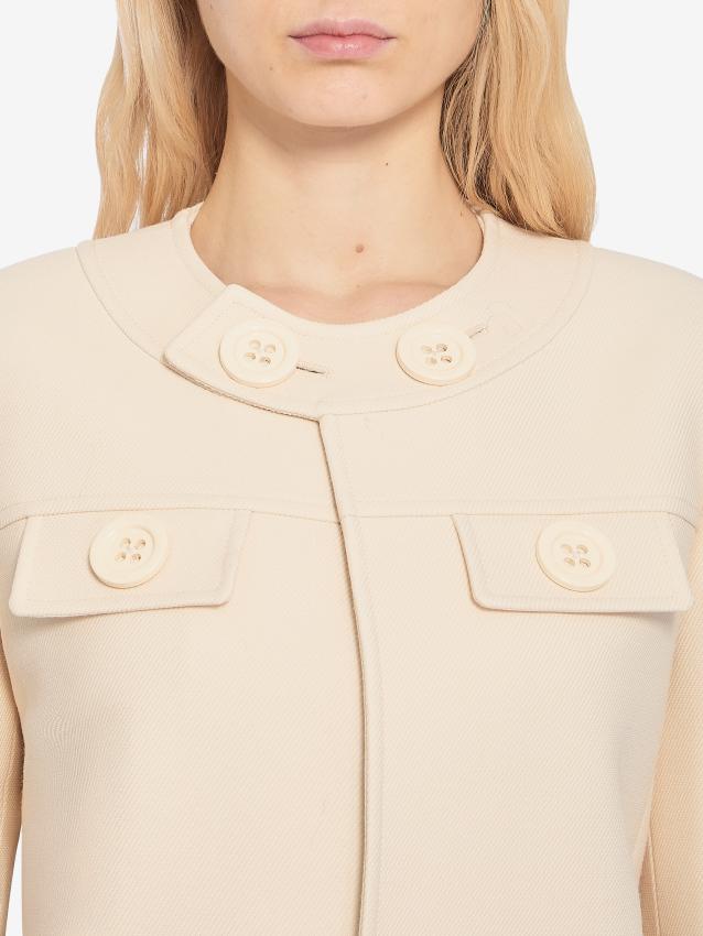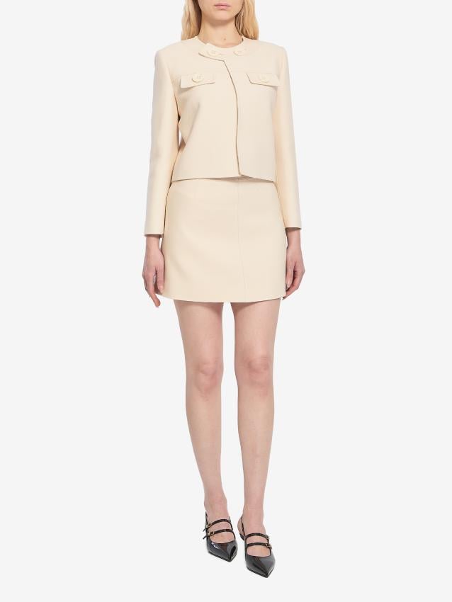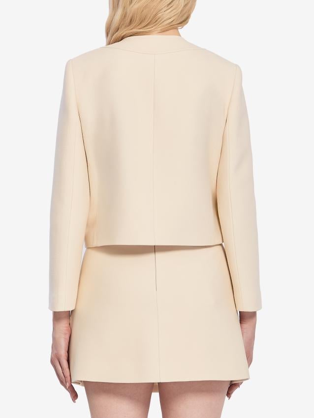 Cropped jacket in a cream-colored wool and silk blend. It features a round neckline with a closure made of two large tone-on-tone buttons, and two