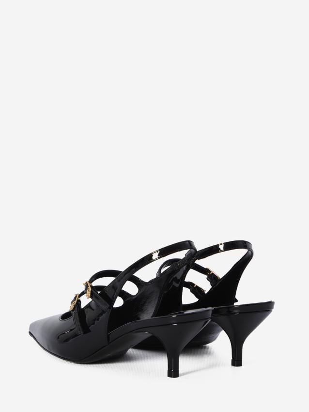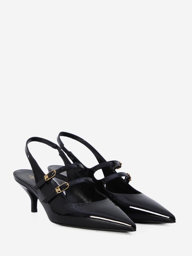 Pointed-toe Mary Jane slingback pumps in black patent leather. They feature two adjustable Mary Jane straps with a Triomphe-embellished buckle on the