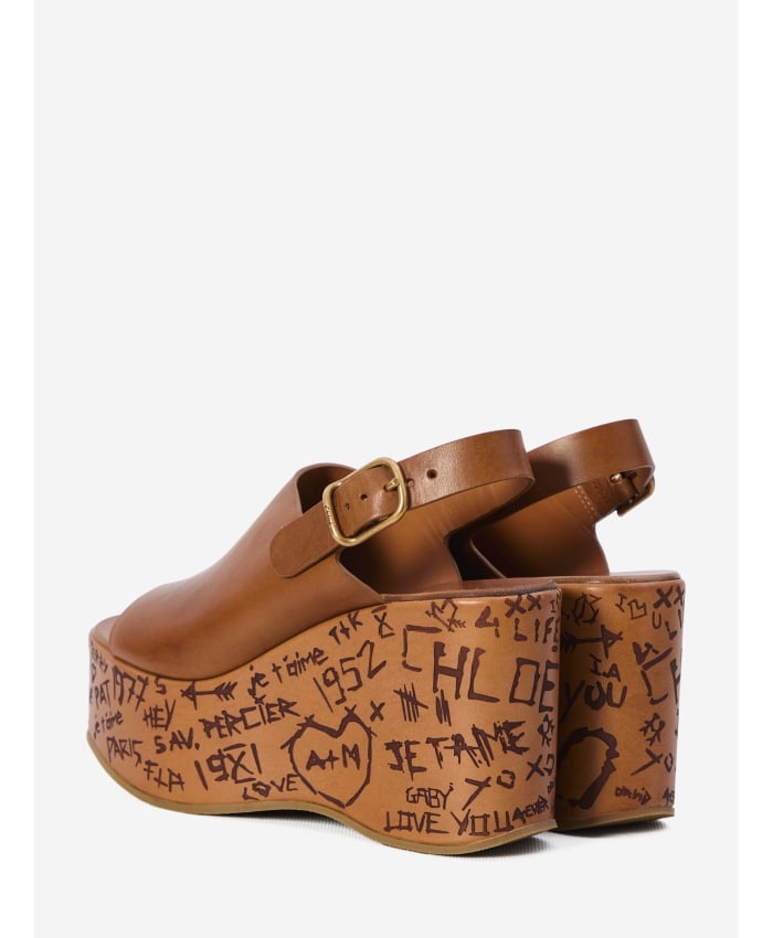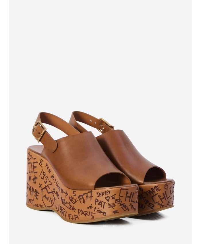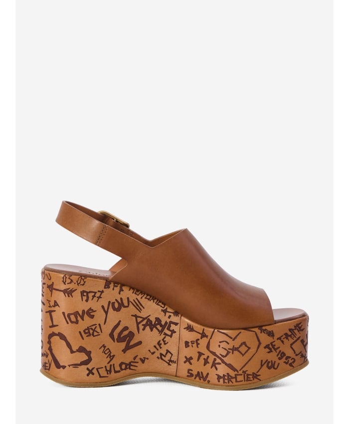 Maxime wedge sandals in brown calfskin leather. Featuring a front cut-out upper, an adjustable ankle strap with an engraved